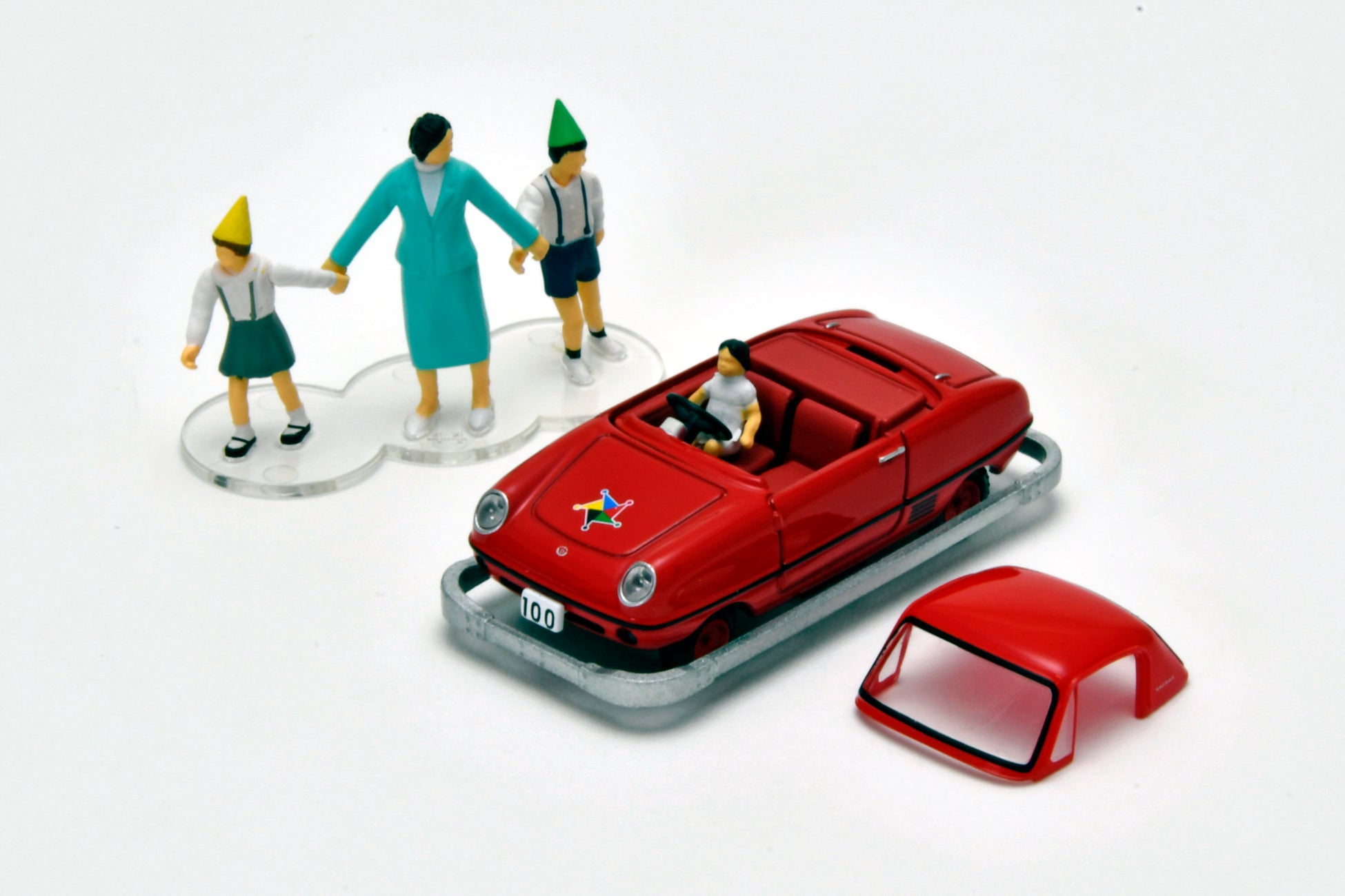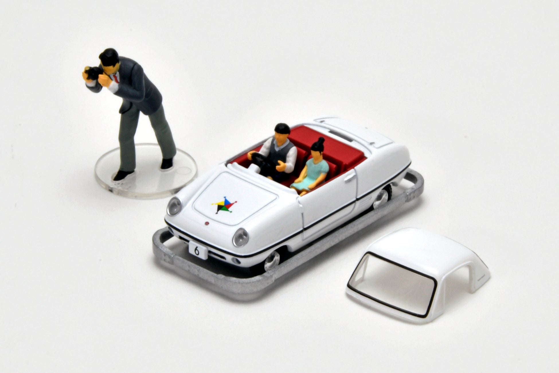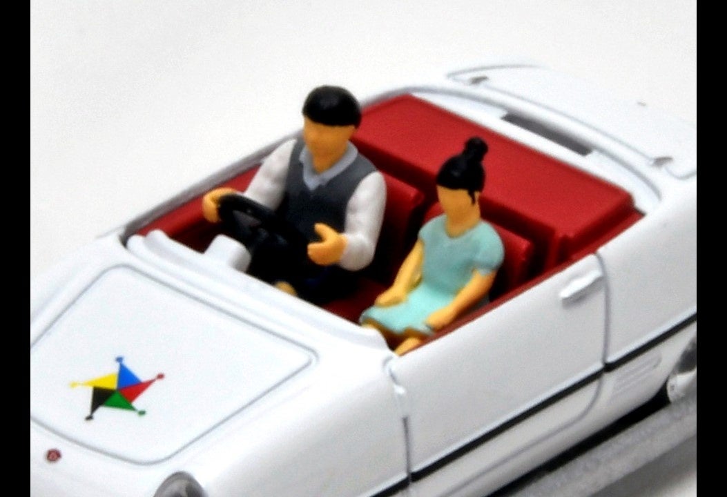 本商品は「トミカリミテッド ヴィンテージ」で「ダットサン ベビイ」を、開園当初を彷彿させる服装のフィギュア付きで製品化いたします。3色(赤・白・水色)が製作された実車のうち、まずは白と赤の2色を展開。白の6号車はホイールキャップを付けた新車当時の姿をイメージし、運転するこどもや写真を撮る大人のフィギュアが付属します。100号車は2014年にレストアされた後の仕様を再現、三角帽を被ったこどものフィギュアが付属します。ダットサン ベビイの屋根は別パーツとし、フィギュアが乗車しやすくなっています。1/64の統一スケールですので、別売りのミニカーと並べると「ダットサン ベビイ」の小ささを感じとることができます。