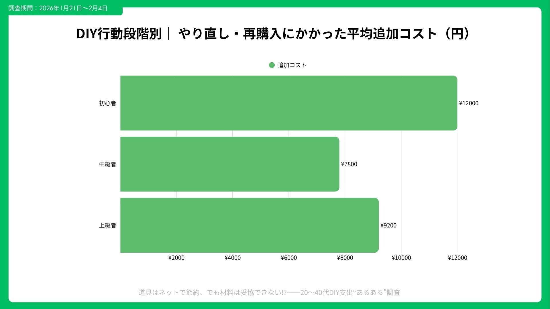 失敗・再購入・返品による追加負担は、年間平均で¥12,400、回数は1.6回/年。 一方、材料を「グレード重視」と回答した層では、再作業回数が約32%減少し、結果的に年間総額が抑えられる傾向が見られた。
