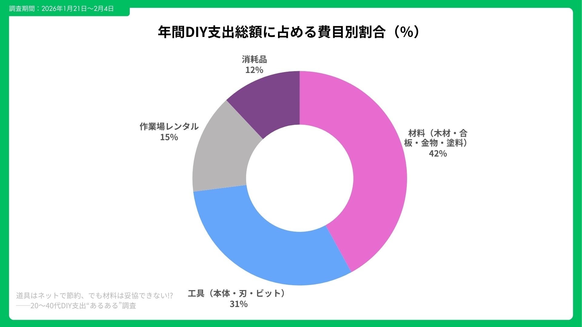 費目別構成比では、工具(本体・刃・ビット)31%、材料(木材・合板・金物・塗料)42%、作業場レンタル 15%、消耗品 12%となった。 特に材料費は「品質差が失敗率に直結する」との認識が強く、全体の58%が「材料は店頭で現物確認」と回答している。