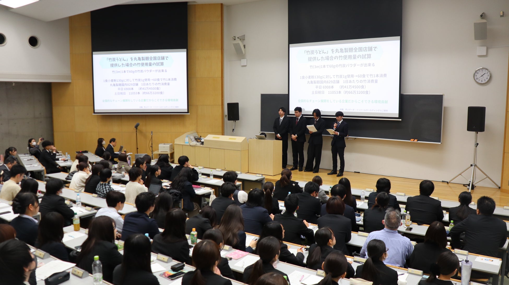 学生たちはまず竹炭の健康効果に着目し、同社が運営する「丸亀製麺」での展開を想定した、竹炭とうどんを組み合わせた商品の可能性を検証。うどんを粉から自作し試食を重ね、味や食感に関するアンケートも実施するなど、約2年間にわたり研究を深めてきました。さらに、竹を用いた店内装飾や食器の提案、里山での環境教育への展開など、幅広い活用案も盛り込みました。