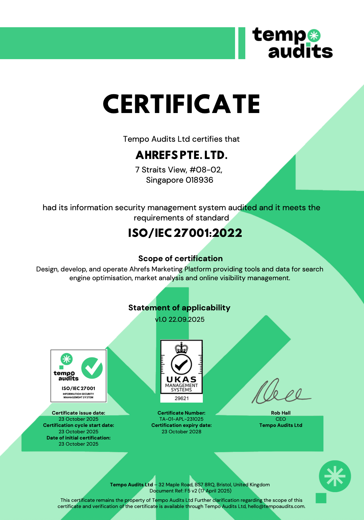 Ahrefs Pte. Ltd. (本社: シンガポール、代表者: Dmitry Gerasimenko) は、情報セキュリティマネジメントシステムの国際規格「ISO/IEC 27001:2022」の認証を取得したことをお知らせいたします。本認証は、英国の認証機関 Tempo Audits Ltd による審査を経て付与されたもので、Ahrefs マーケティングプラットフォームにおける情報セキュリティ管理体制が国際的な基準を満たしていることが証明されました。
