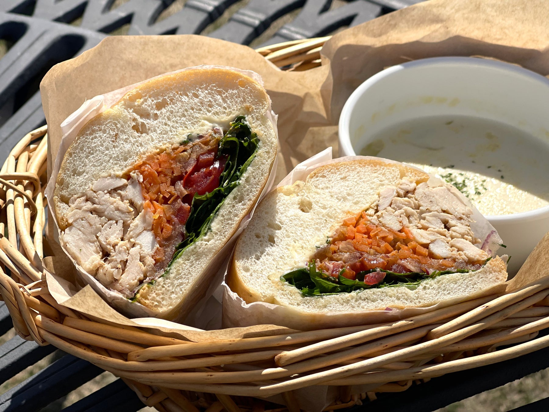 信州の豊かな自然環境の中で飼育された"福味鶏"を低温調理で丁寧にしっとりと仕上げたサラダチキンをたっぷりと使用しています。ディル・ケール・ルッコラ・セルフィーユをミックスした4種のハーブ野菜や、長野県産フルーツトマト、手作りキャロットラペなど、地元野菜をふんだんにサンドしました。心もカラダも喜ぶごちそうサンドです。
