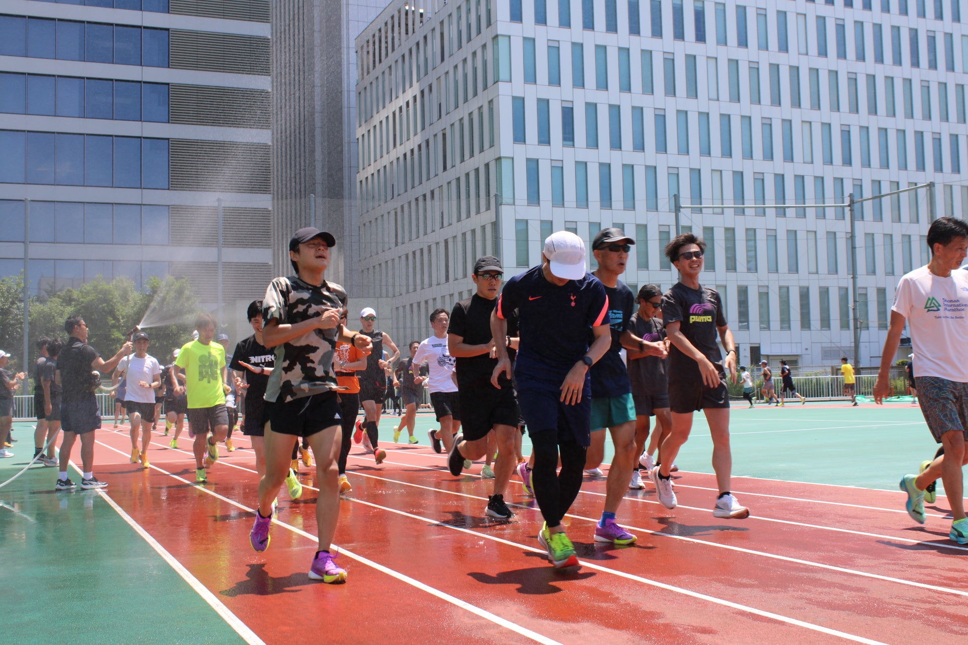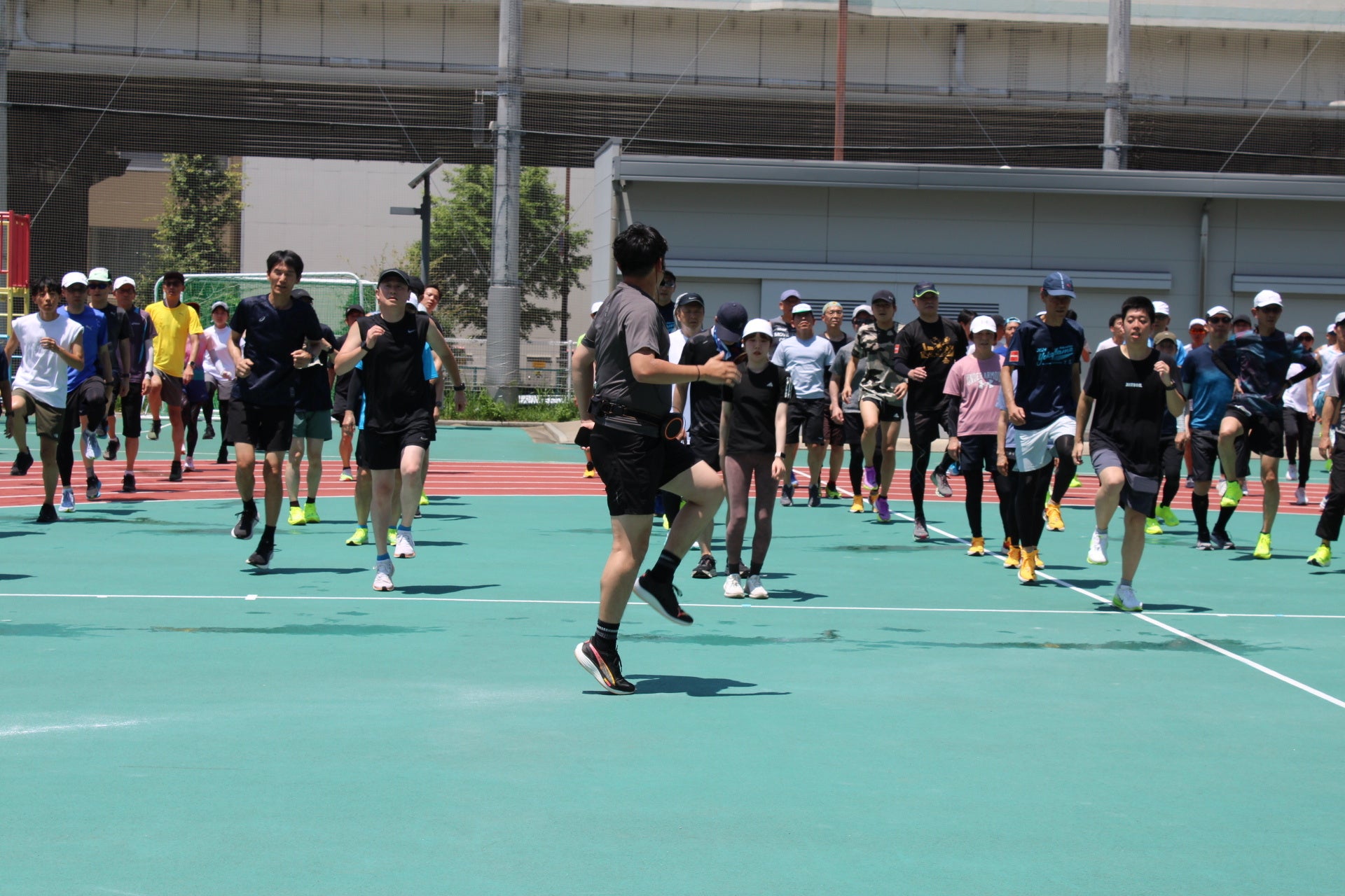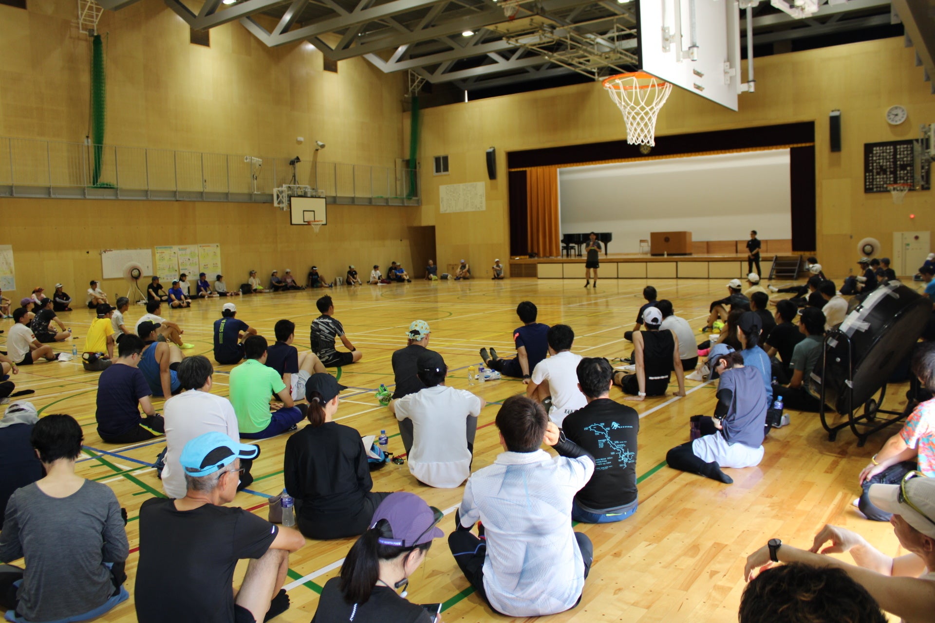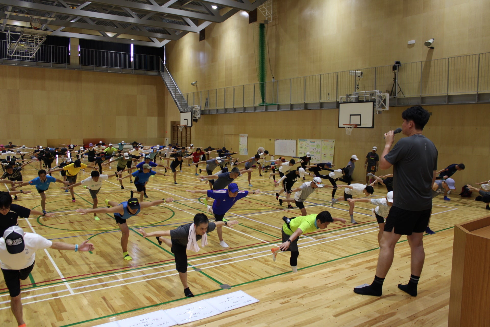 今回は、インターバルトレーニングで <速く走る>ことを脳と体で学習することによって、より速く走る・持続する・タイムを短縮することが狙いです。座学では、テーマにまつわる講義と共に、コーチが「速度や強度を落とさずに、休憩を取りながらがんばりましょう」と激励。「なかなかスピードが出ないときは、ペーサーや今日一緒にトレーニングをする仲間の力を借りましょう」とアドバイスを送りました。ウォーミングアップを行った後は、目標タイム別(サブ3.5、サブ4、サブ4.5、サブ5、完走)グループに分かれて、200m走を各グループ約10本、しっかりと休憩を取るなど、熱中対策をし、炎天下の中ながら、見事に走り切りました。