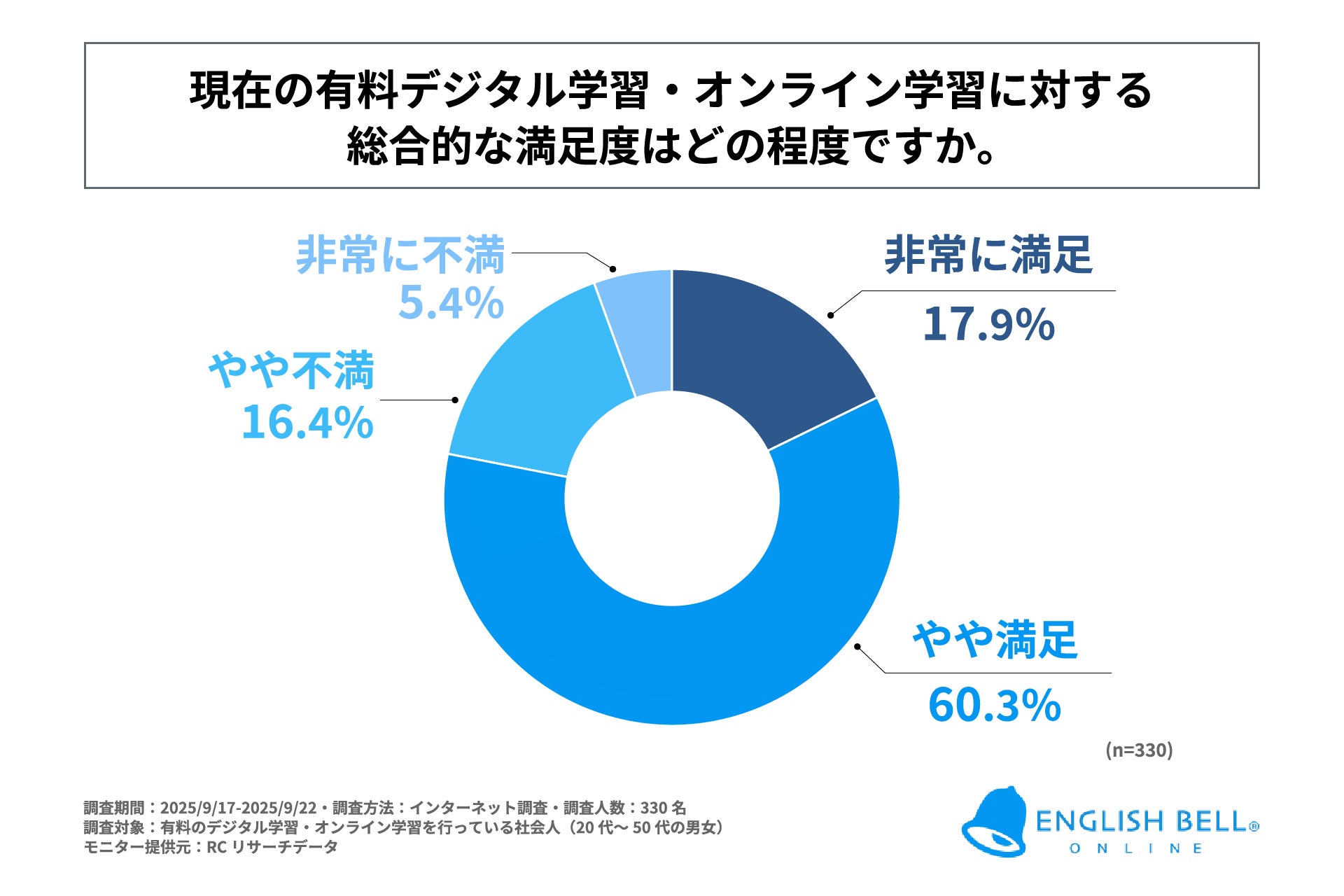 有料のデジタル学習・オンライン学習を行っている社会人の75%以上が現在、その学習に対して少なからず満足している