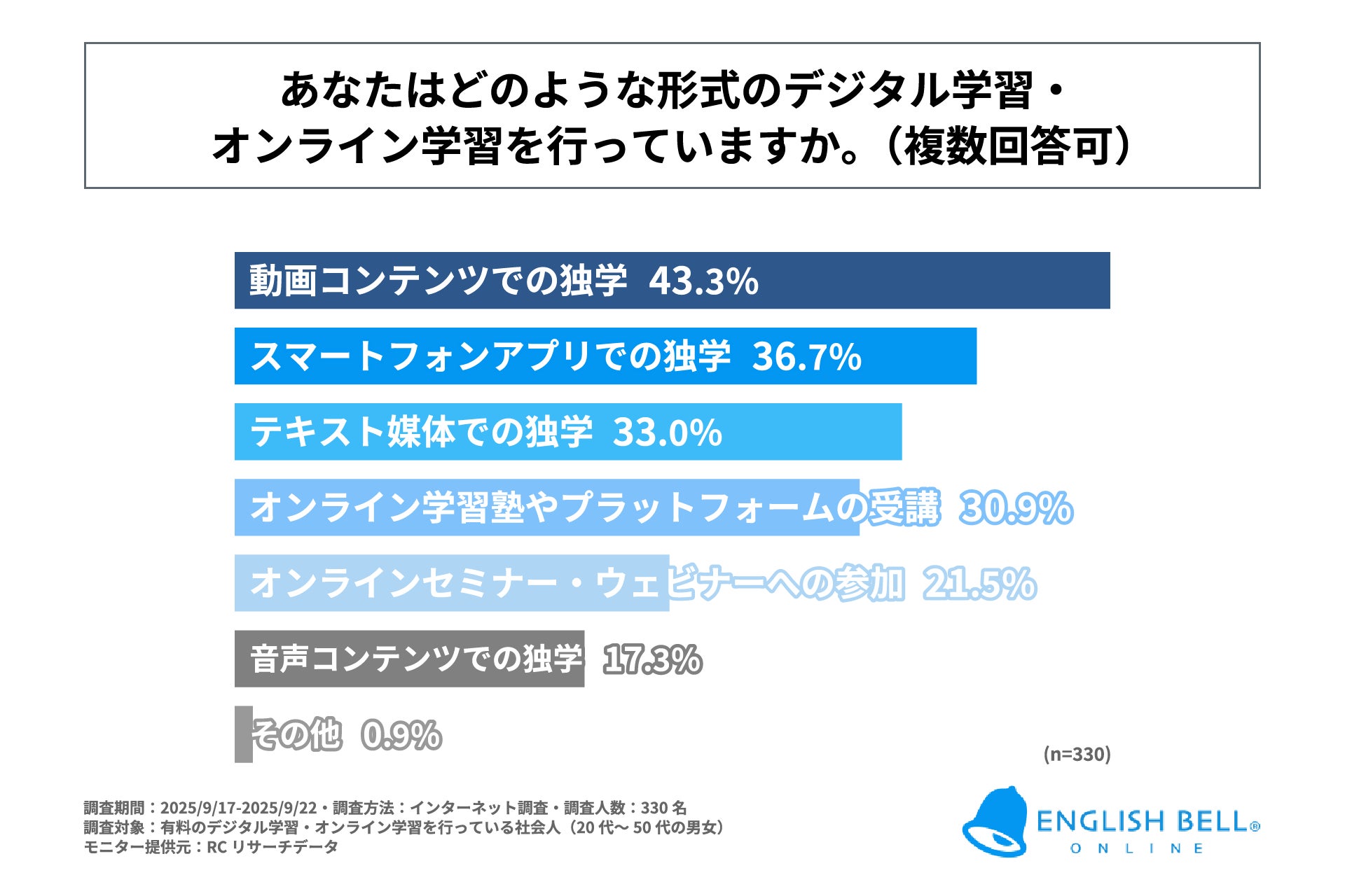 また、「どのような形式のデジタル学習・オンライン学習を行っているか」を尋ねる設問への回答では、1位が「動画コンテンツでの独学」で43.3%、2位が「スマートフォンアプリでの独学」で36.7%、3位が「テキスト媒体での独学」で33.0%という結果になりました。この結果から、有料のデジタル学習・オンライン学習を行っている社会人の学習方法で最も多いのは、「動画コンテンツでの独学」であることが明らかになりました。