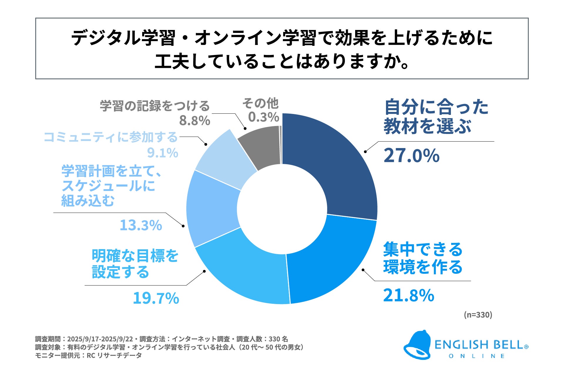 調査の最後、「デジタル学習・オンライン学習で効果を上げるために工夫していること」を尋ねる設問への回答では、1位が「自分に合った教材を選ぶ」で27.0%、2位が「集中できる環境を作る」で21.8%、3位が「明確な目標を設定する」で19.7%という結果になりました。この結果から、デジタル学習・オンライン学習を行っている社会人が、その学習効果を上げるために工夫していることとして最も多いのは、「自分に合った教材を選ぶこと」であることが明らかになりました。