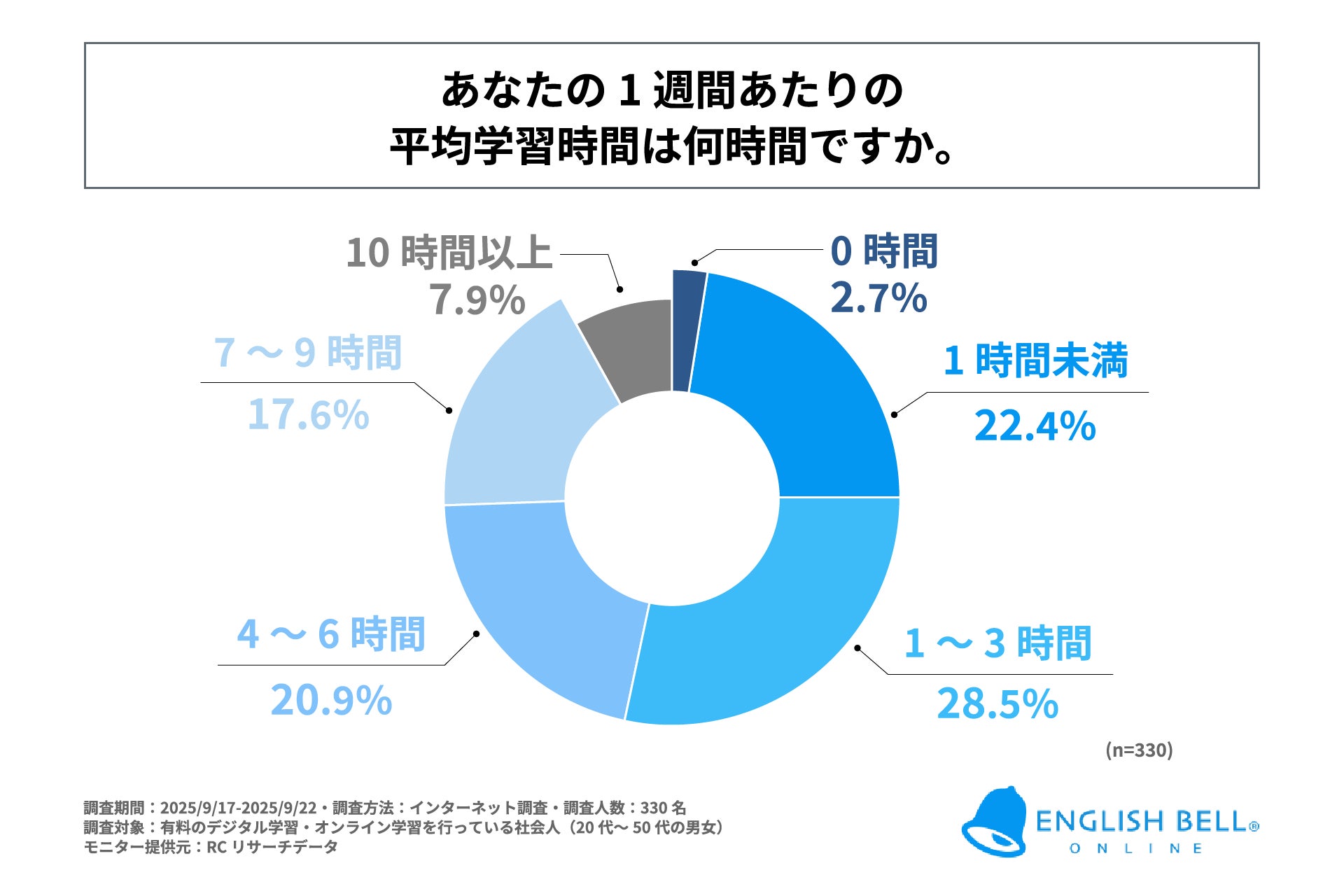 有料のデジタル学習・オンライン学習を行っている社会人のうち半数以上の人は、1週間あたりの平均学習時間が「3時間以下」
