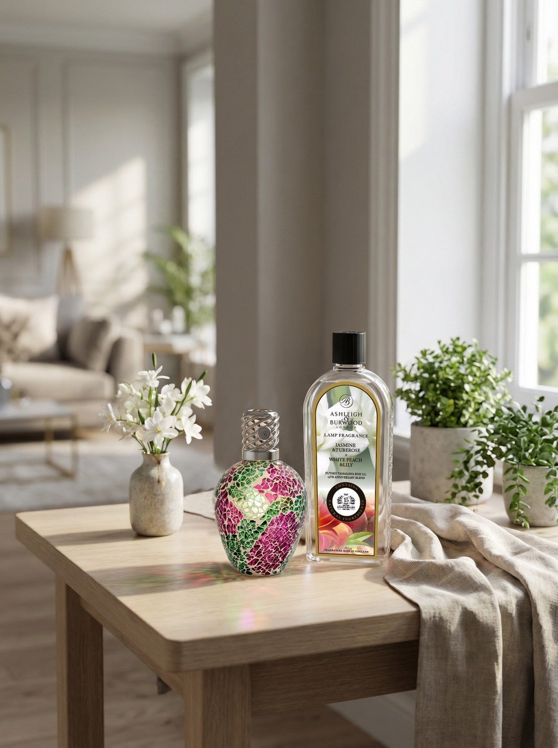 ジャスミンの上品でエレガントな香りに、ホワイトピーチの可愛らしさをプラスしたランプフレグランスです。