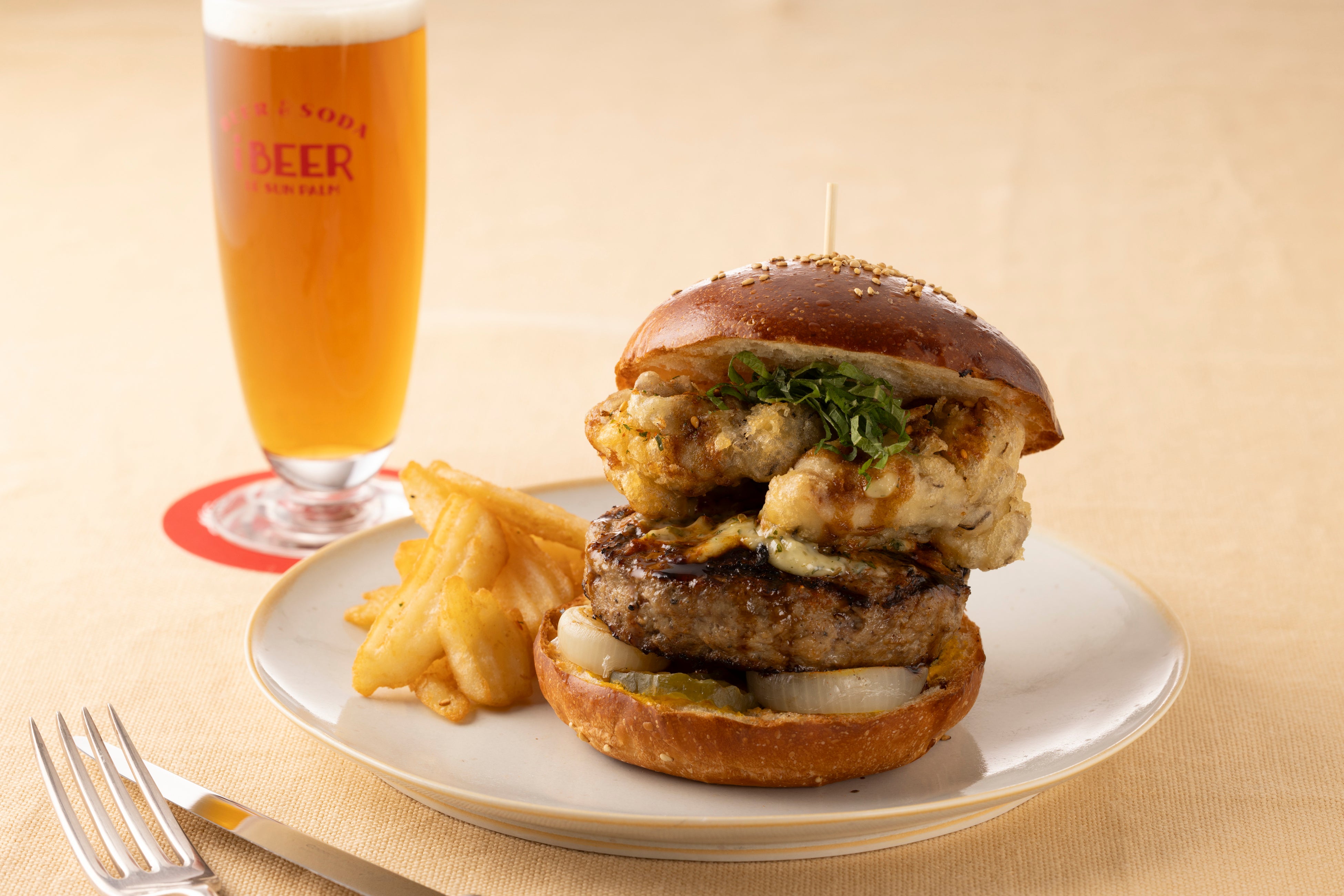 人気の『和牛と黒豚のプレミアムバーガー』にお客様からもご好評いただいている、特製てりやきソースに間違いなくあう!と考えた舞茸フリットをトッピングしました。