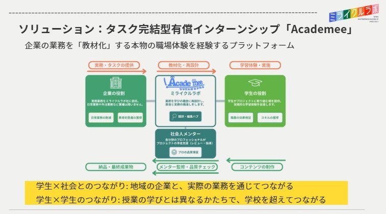 ミライクルラボが展開する「Academee」は、企業のリアルな業務を学生の「教材」に再設計し、成果物を「納品」するまでを学びに転換する独自のプログラムです。これにより、企業の課題解決と学生の成長を同時に実現する“教育×事業“モデルを構築します。