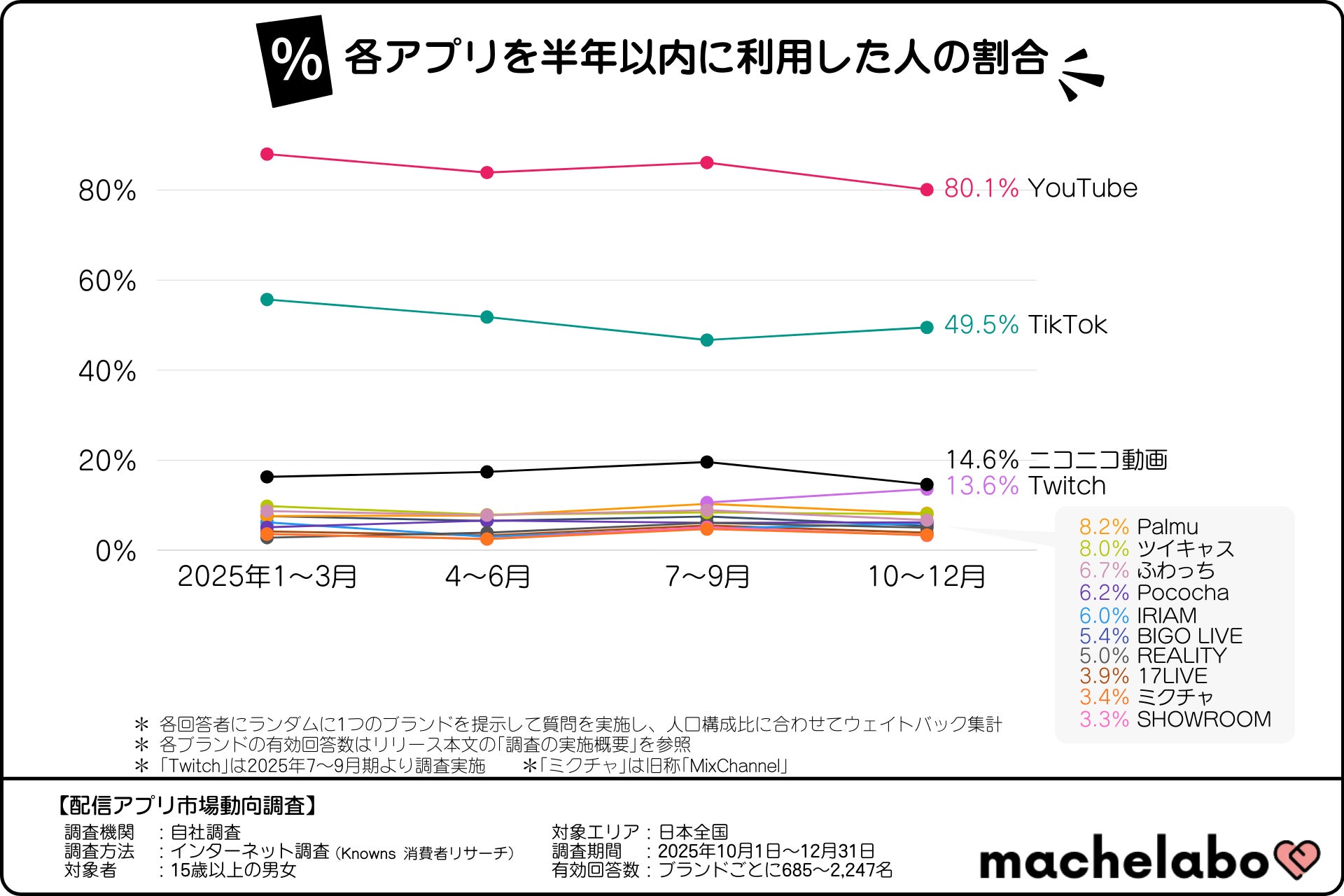 2025年10~12月期の利用率は、『YouTube』が80.1%と突出して高く、『TikTok』が49.5%で続きました。これらに次ぐ水準として、『ニコニコ動画』が14.6%、『Twitch』が13.6%を記録しており、両サービスが10%台半ばで競り合う形となっています。