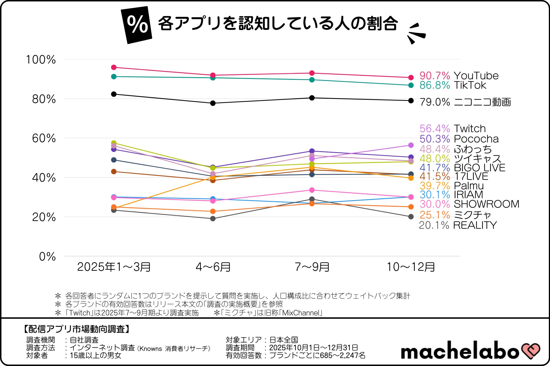 一方で、着実に数値を伸ばしているサービスもあります。『Twitch(ツイッチ)』は調査を開始した7~9月期の49.4%から直近では56.4%へと上昇し、半数以上の認知を獲得しました。また、『Palmu(パルム)』も1~3月期の24.3%から年間を通じて認知を広げ、10~12月期には39.7%となるなど、特定のジャンルや比較的新しいサービスも着実に浸透が進んでいます。