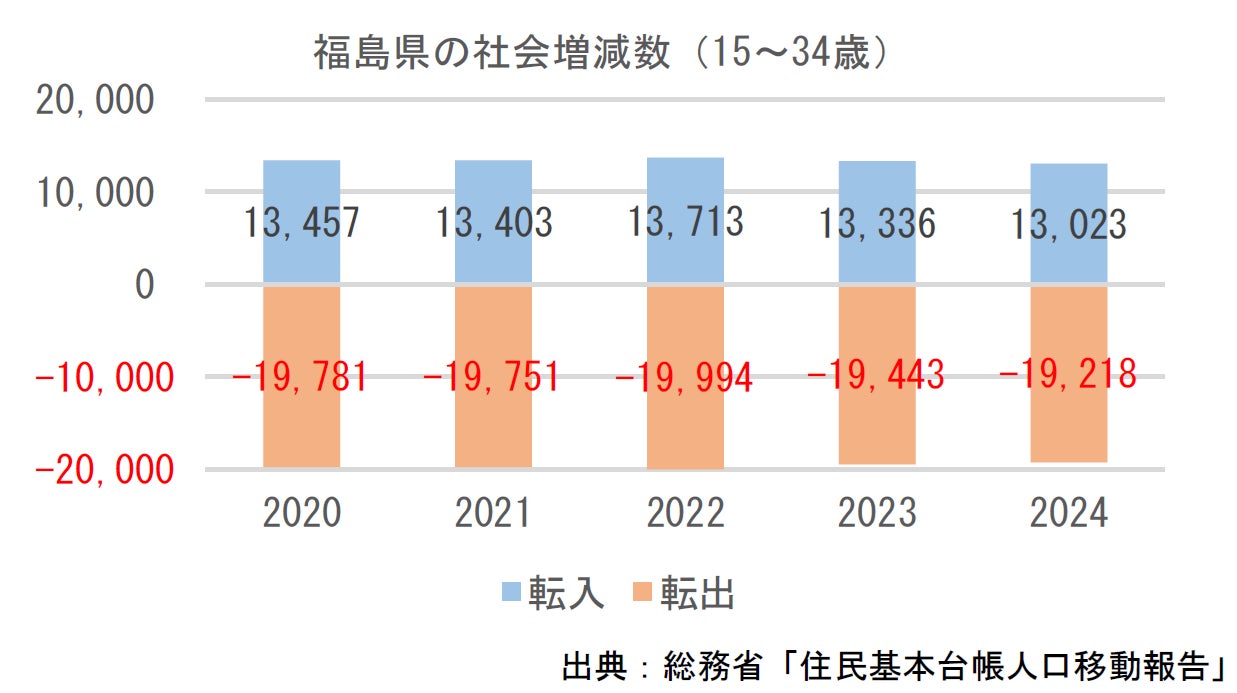 県全体で毎年20 ,000 人近い若年者が県外に転出しています。また、15~34歳の若者の転出超過は毎年 6,000 人以上となっています。