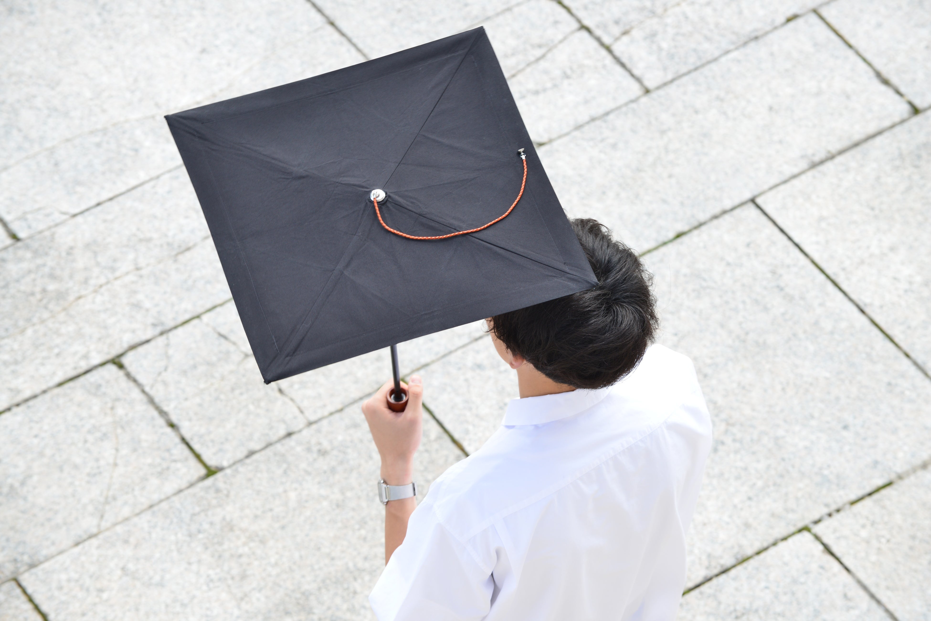 禅の引き算の美学から生まれた、水平スクエアのミニマルデザイン。160gの軽さと静かな存在感を兼ね備えた、新しい都市型日傘。デザイナーズゲート(DG-32)に登場