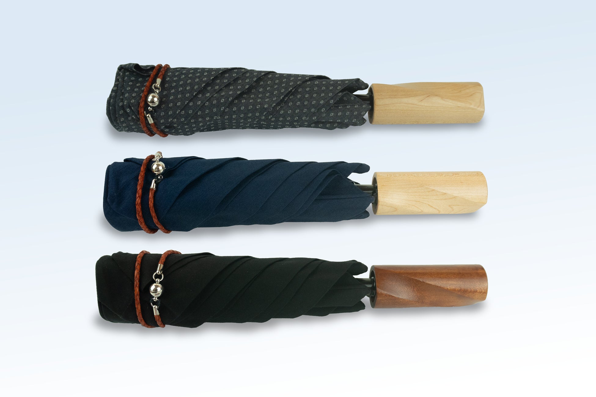 本体重量は約160g、折りたたみ時は約28cm。生地には岡山県倉敷市児島で染色された綿布を用い、天然メープルのハンドルや革紐、マグネット機構など、細部にわたり静謐な質感を重ねています。手にしたときにのみ感じられる、自然に手に馴染むつくりです。