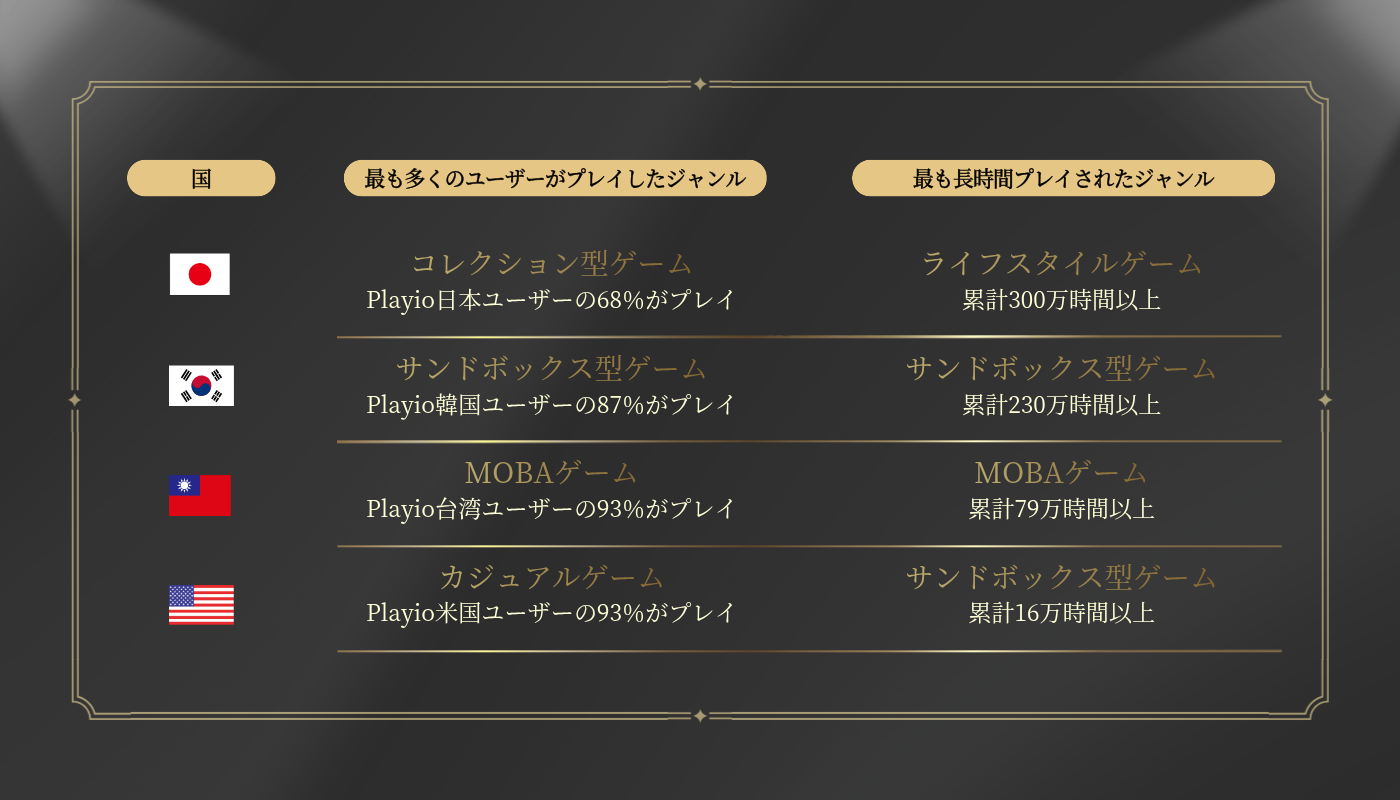 Playioのデータにおいても、韓国・アメリカのユーザーは、これらのジャンルにおいてプレイヤー数・累積プレイ時間ともに高い比重を示した。