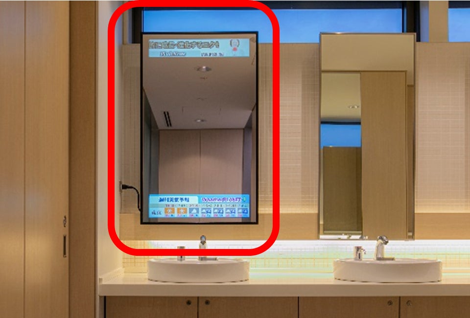 本実証は、新丸ビルに就業する三菱HCキャピタルおよびAGCの従業員を対象に、二段階で実施しました。両社が入居する各フロアの化粧室に、AGCが販売するディスプレイ一体型ミラー