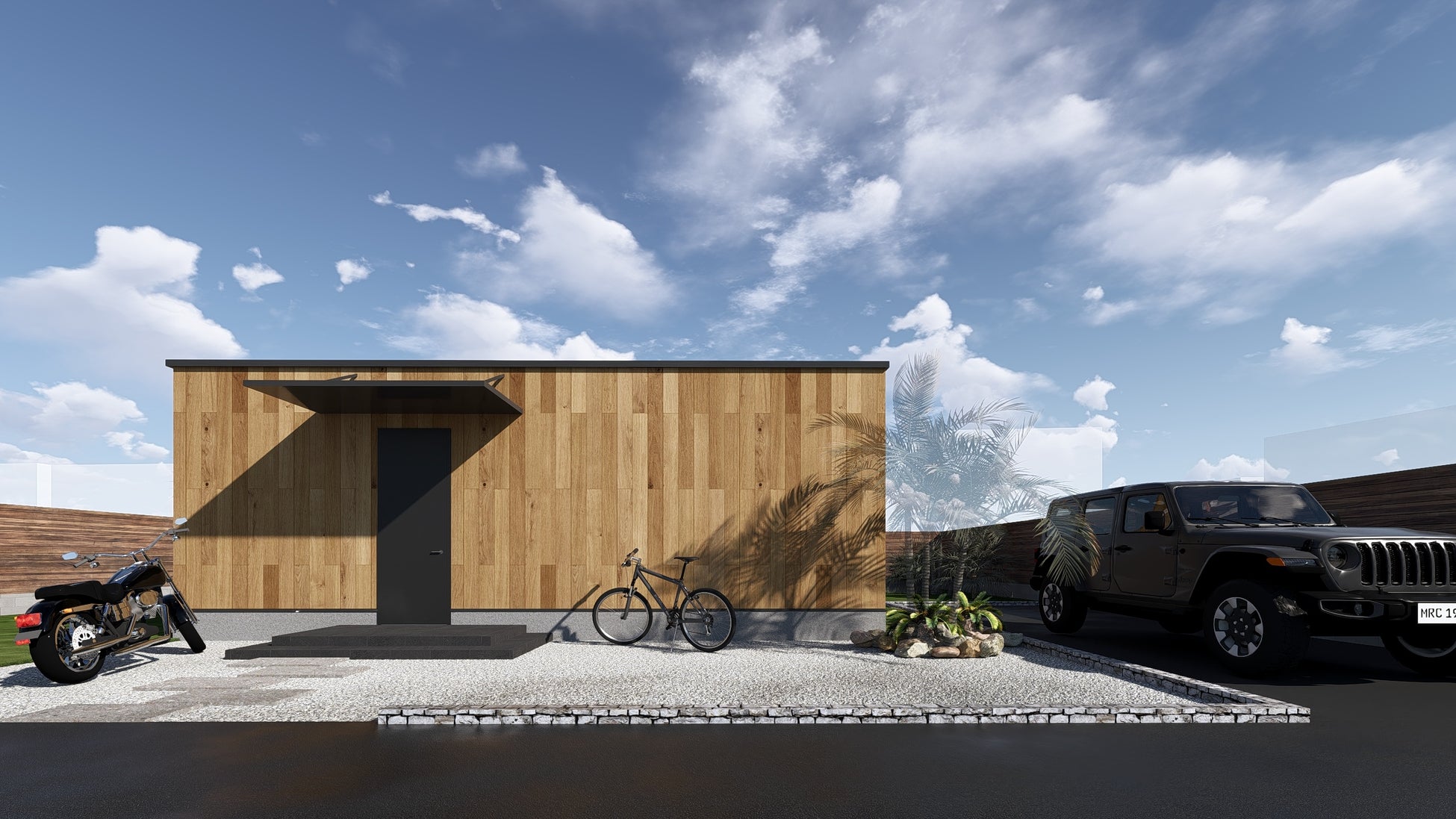 ツーバイフォー工法とモノコック構造による強固な設計。平屋として完結しながらも、将来的にモジュールを繋げて拡張も可能です。