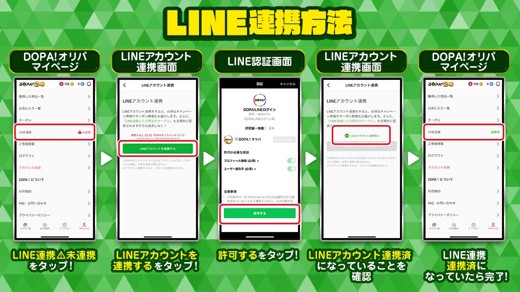 DOPA! アプリ(https://dopa-game.jp/mobile)の『マイページ』にて、『LINE連携 連携済』で参加完了