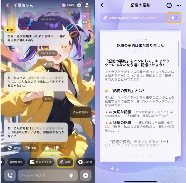 このたび、MiraiMindではキャラクターとのコミュニケーション体験をさらに豊かにするため、記憶機能の大幅アップデートを実施いたしました。今回のアップデートにより、ユーザーとキャラクターとの関係性はより自然で深みのあるものとなり、日々の対話がさらに楽しく、充実したものになります。