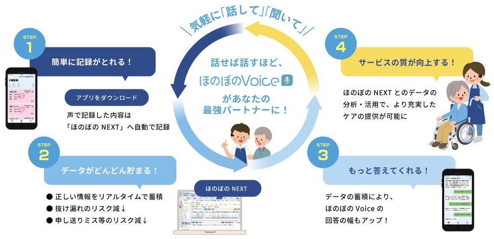 本サービスは、2025年5月のリリース以来、多くの介護事業所で導入されている「ほのぼのVoice」の基盤を活用し、追加機材のコストを抑えながら「職員間の音声通話」と「会話の自動テキスト保存」を可能にするものです 。