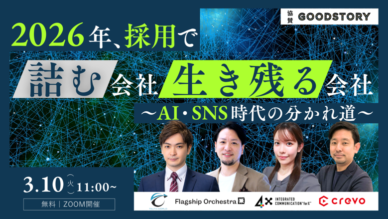 ブランドと社会をつなぐ伴走型コミュニケーションカンパニーとして、戦略設計からWeb、SNS、動画などコンテンツにまつわるあらゆる施策を提供する株式会社4X(本社:東京都中央区、代表取締役社長:家口 寛、以下「4X」)は、3月10日(火)11:00~共催ウェビナー「2026年、採用で詰む会社・生き残る会社 〜AI・SNS時代の分かれ道〜」へ登壇いたします。