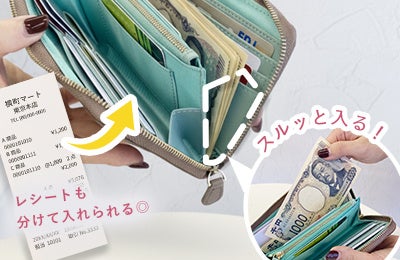 ミニバッグにもすっきり収まるサイズ感ながら、お札は折らずに出し入れ、通帳の収納も可能です。