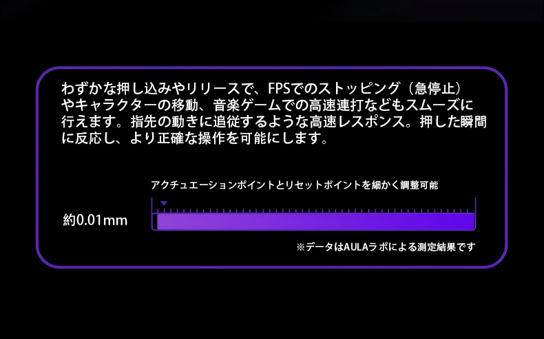 アクチュエーションポイントは0.1mmから3.4mmの範囲で調整可能で、最高0.01mm単位でのラピッドトリガー(RT)調整精度を備えています。これにより、ユーザーは使用シーンに合わせて入力位置を細かく設定できます。例えば、競技ゲームでは作動点を浅くして応答速度を高め、日常的なタイピングでは適度に深くすることで誤入力を減らすといった使い分けが可能です。