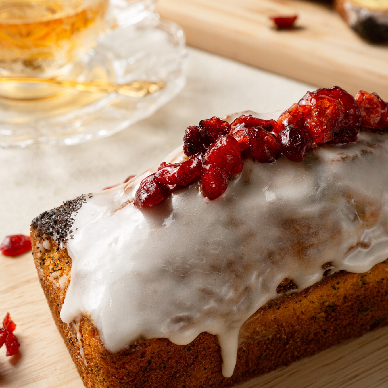 アールグレイがふんわりと香るしっとり生地に、ストロベリーの風味をまとわせたクランベリーを合わせたパウンドケーキ。紅茶の華やかさに、やさしい甘みと甘酸っぱさが重なり、ひと口ごとに広がる上品な味わいです。