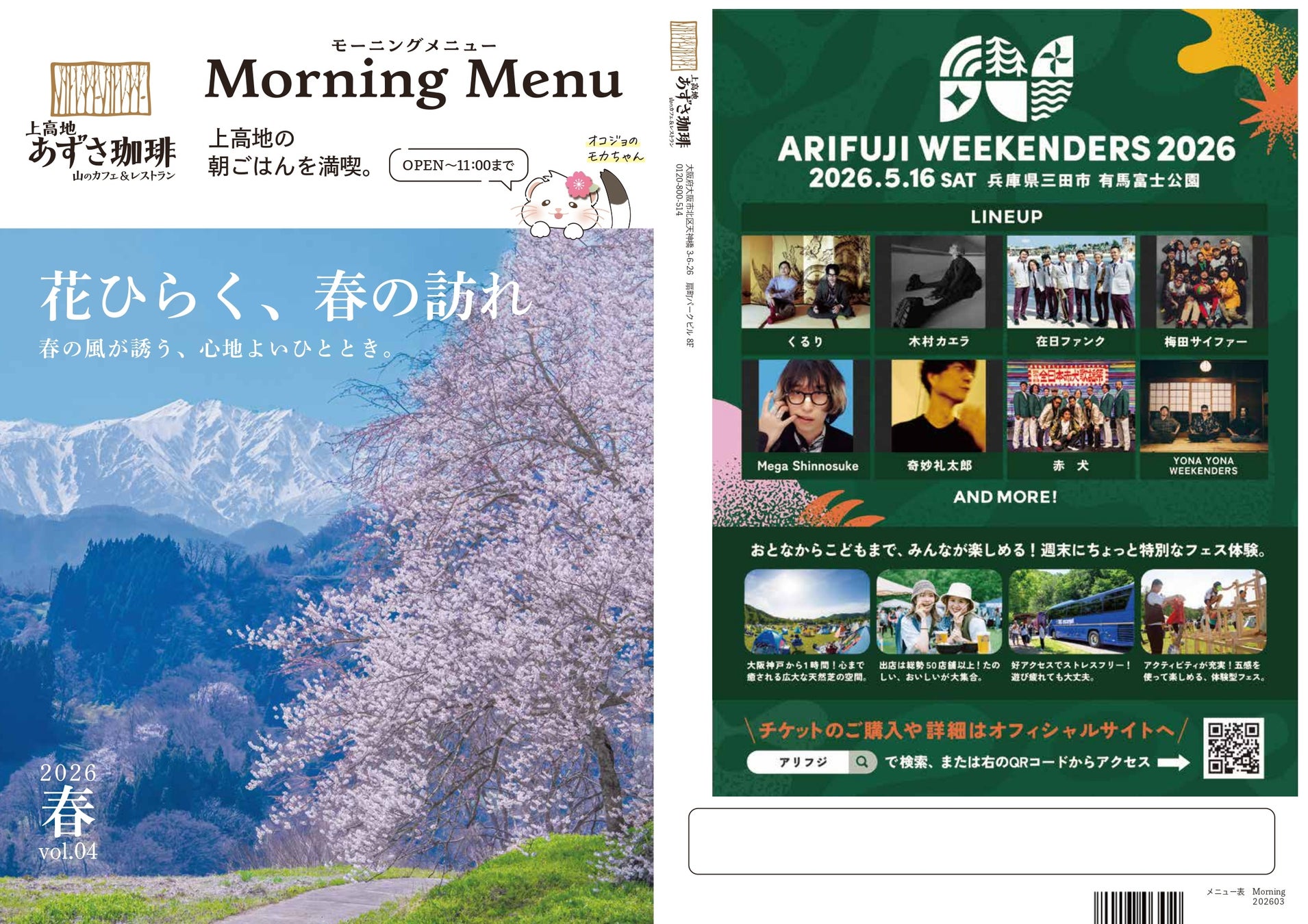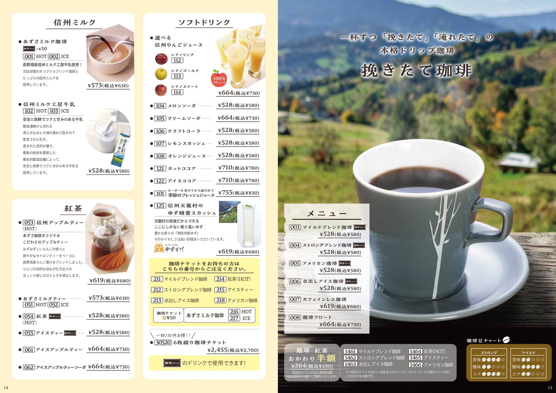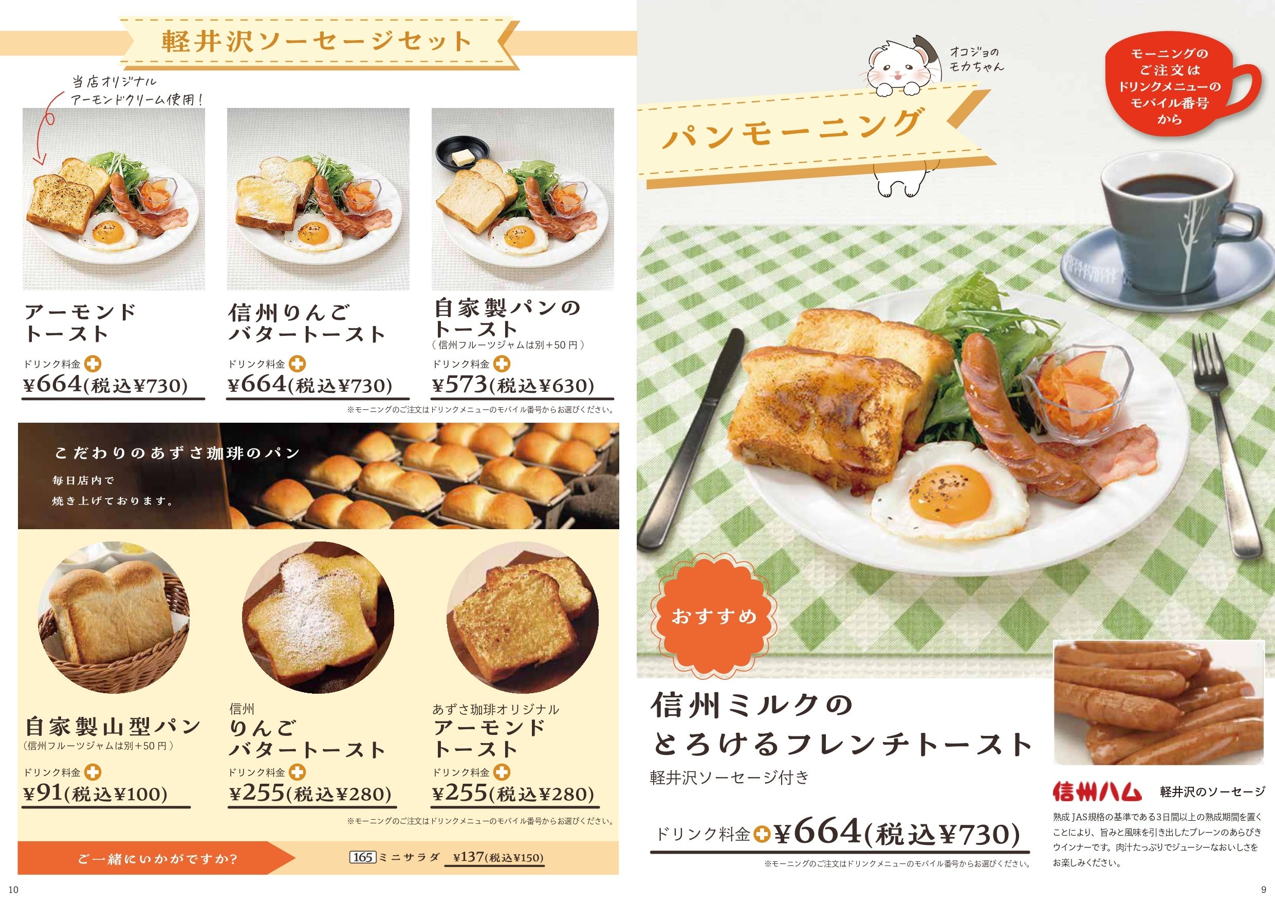 あずさ珈琲のモーニングメニューは雑誌のようなメニューになっております。