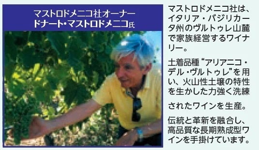イタリア・バジリカータ州のヴルトゥレ山麓で家族で経営するワイナリー。土着品種“アリアニコ・デル・ヴルトゥレ”を用い、火山性土壌の特性を生かした力強く洗練されたワインを生産。伝統と革新を融合し、高品質な長期熟成型ワインを手掛けています。
