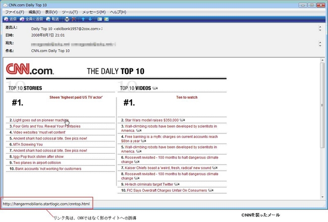 新たなスパムメールの動向として、8月に入ってからCNNを装ったスパムメールが急激に増えてきた。このスパムメールは、CNNのニュース記事や動画ランキングをリンク付きで掲載しており、リンクを先のURLにアクセスすると、CNNの偽サイトに誘導され、悪意のあるウイルス等をダウンロードさせようとする。主な件名は「CNN.com Daily Top 10」として送られてくるが、類似した件名も確認した(中身はほぼ同様)。