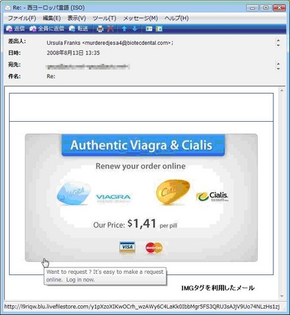 6月、7月に減少しつつあった画像スパムだが、8月はわずか2通にまで減った。しかし、別の手法で画像を表示させようとしているメールが急激に増えてきた。今までは、メールに直接画像ファイルが添付されていたが、最近ではHTMLメールにIMGタグを使い、フリーのサーバから画像を参照させる手法にシフトしているようだ。(図:IMGタグを利用したメールをご参照ください。)