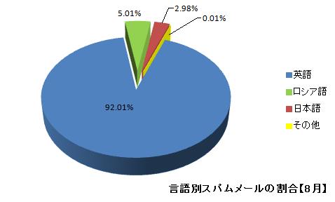 検証環境に送られてくるスパムメールを言語別に分類すると、英語が約92.01%、ロシア語が約5.01%、日本語約2.98%、残りが中国語やヨーロッパ言語等だった。先月と比較すると、英語メールが約6%減った分、それ以外の言語が増える結果となった。(図:言語別スパムメールの割合をご参照ください。)
