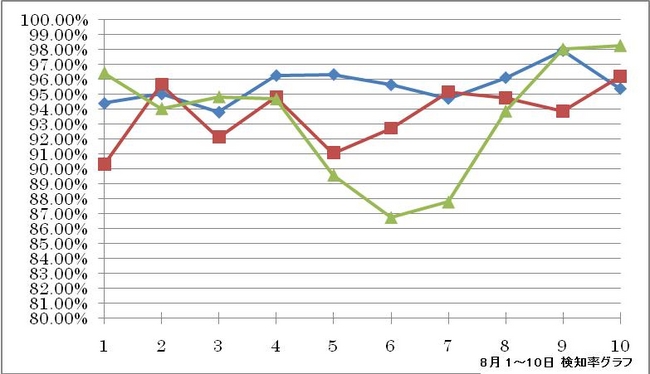 今回の判定漏れが多かったメールは、前述したCNNやBBCを装ったメールが非常に多かった。特に、同メールが急増し始めた8月初旬に注目してもらいたい。4製品中3製品がこの次期に大幅に検知率を落としている。これは、CNNを装ったスパムメールのほとんどが検知できなかった結果によるものである。その後、定義ファイル等の更新により検知率は回復したが、これらのスパムに対応できるようになるまでの期間に、大きな差が出た。最長で3日以上の時間を要したものもあり、製品によっては、今後の新種のスパム対応に課題を残す結果となった。(図:8月 1~10日 検知率グラフをご参照ください。)