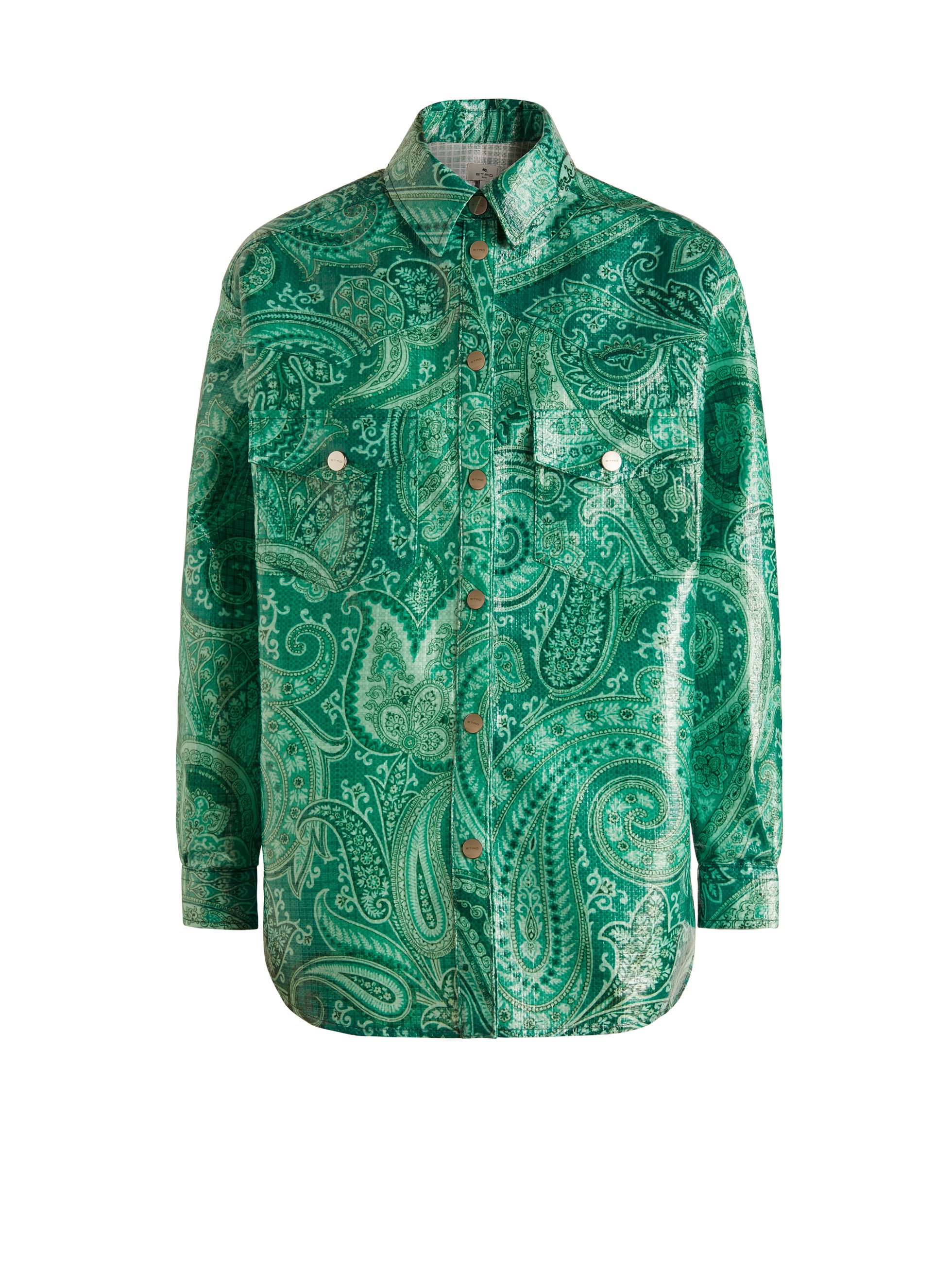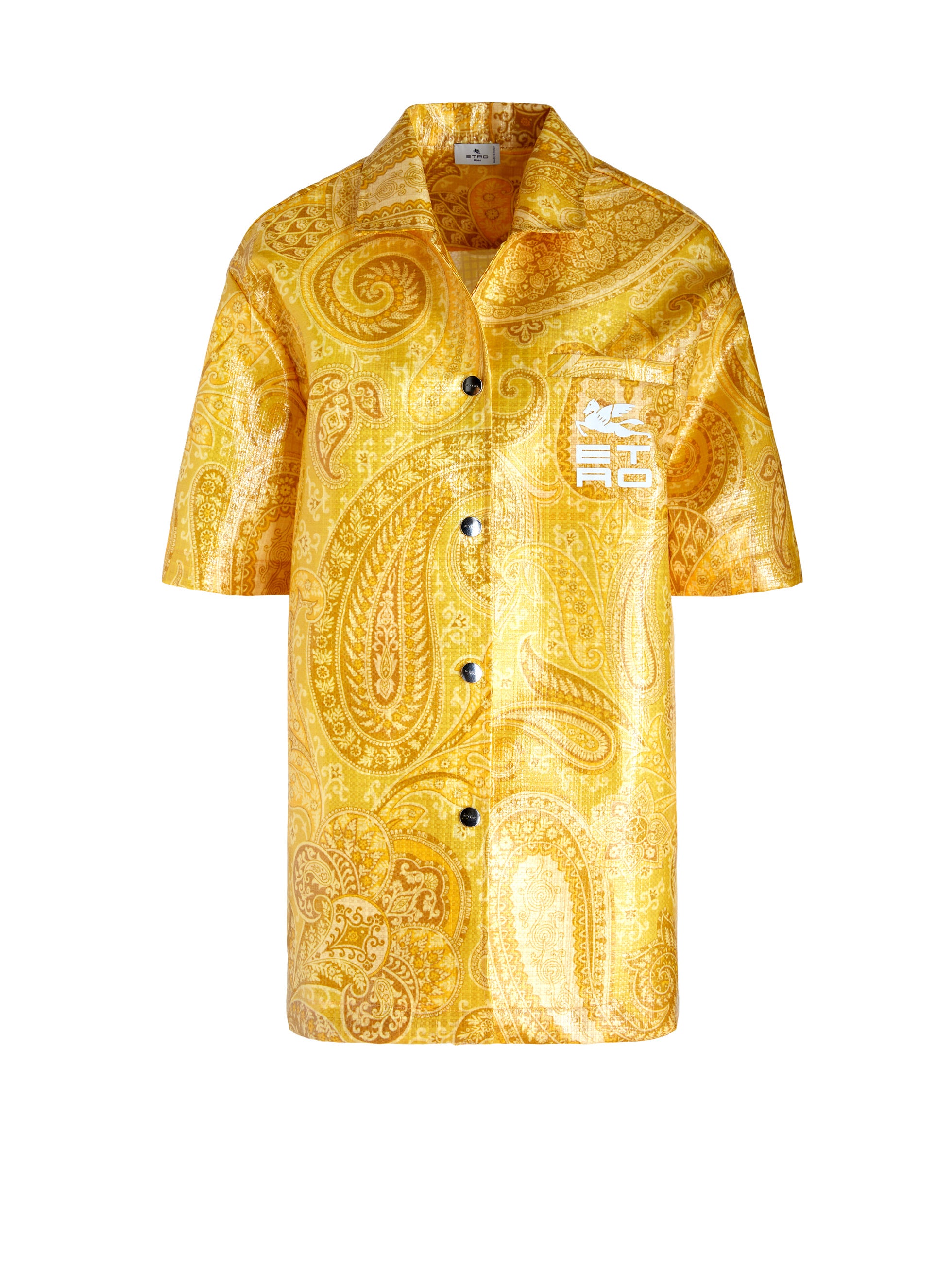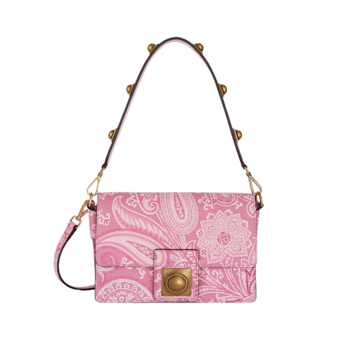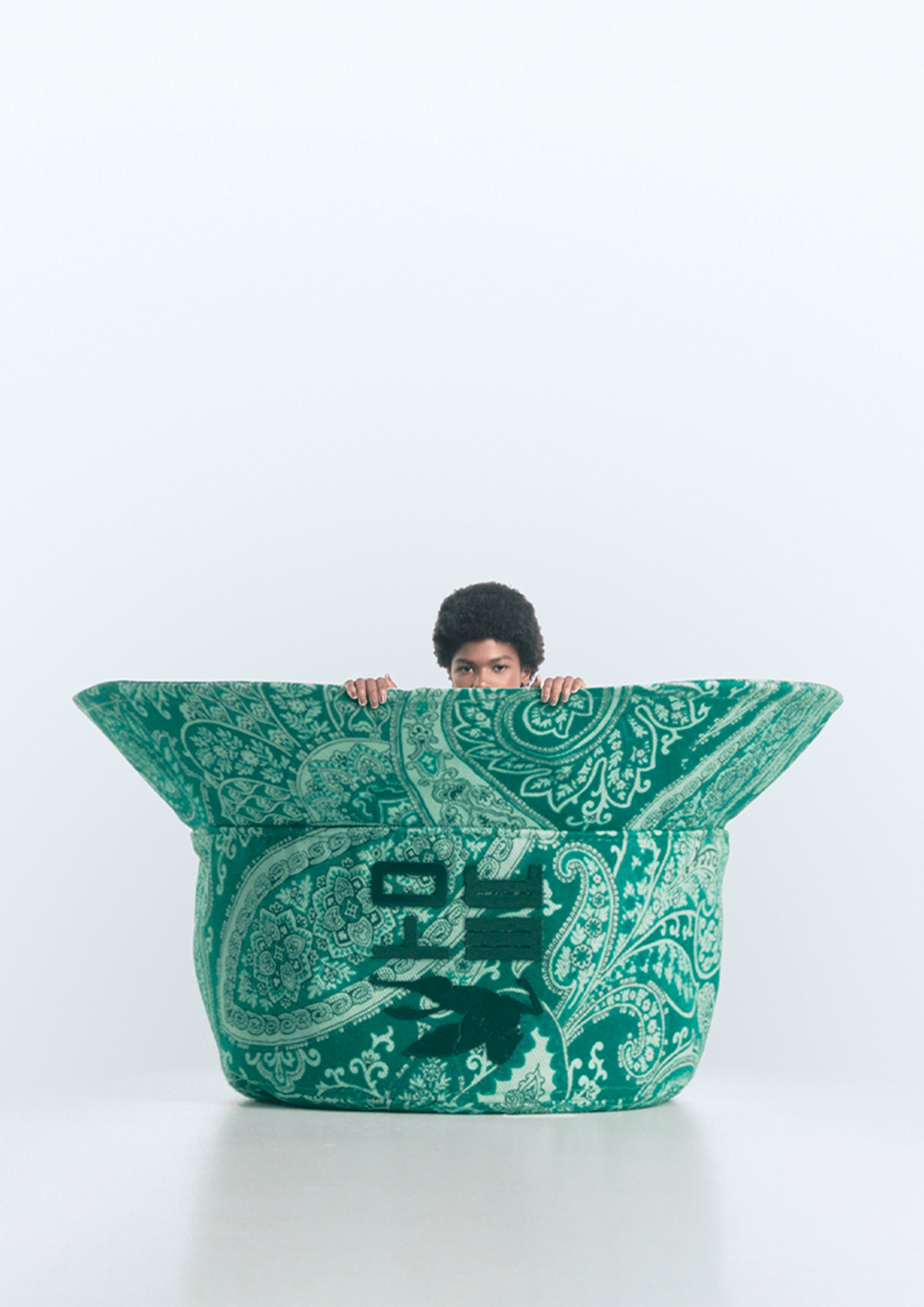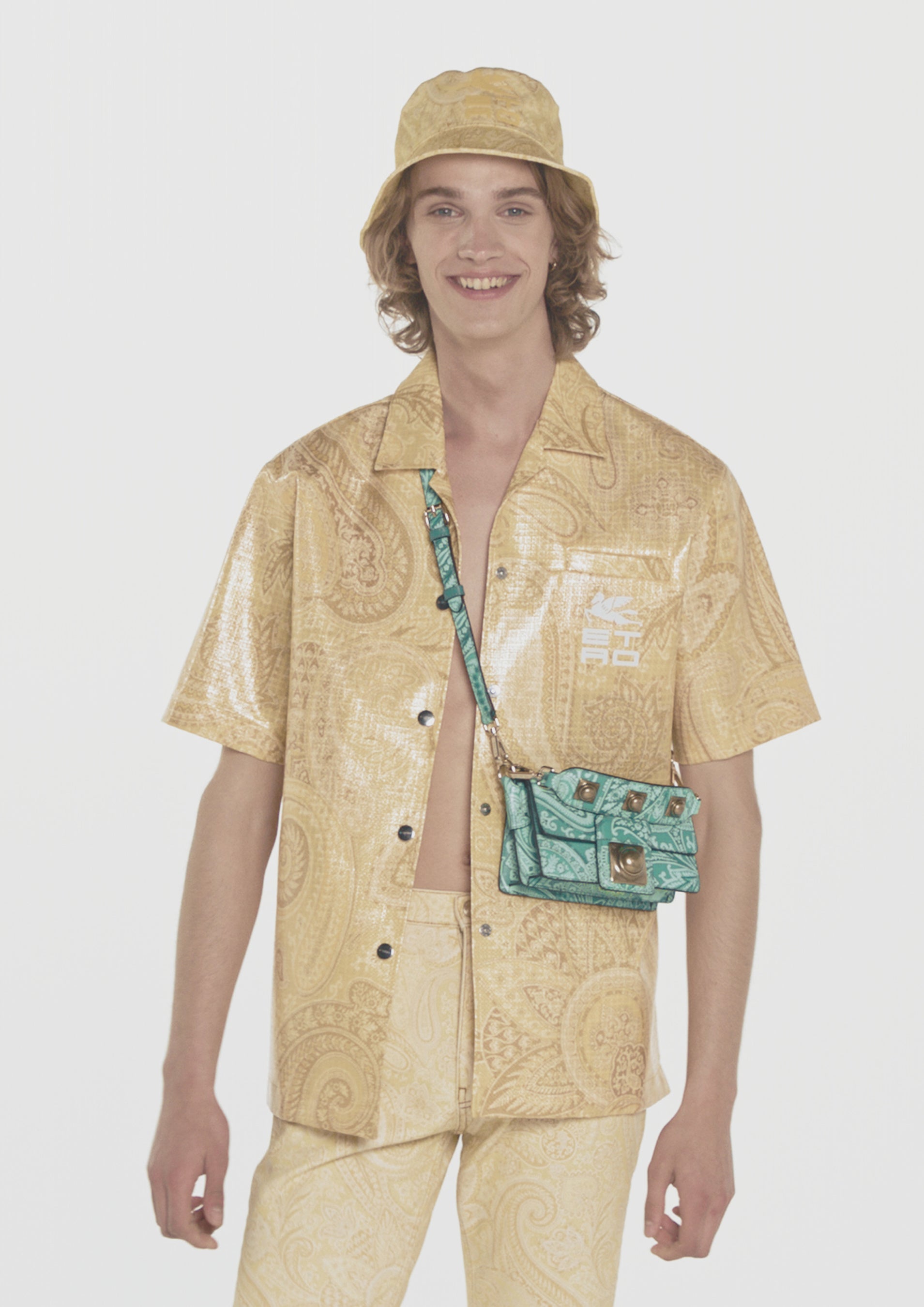 エトロのモノクロームともいうべきトーン・オン・トーンのペイズリー柄は、ブランドの新たなエンブレムとしてタトゥーのように広がり、艶やかなコーティングナイロン素材のシャツ、グローブトロッターバッグやバケットハットをはじめ、ニット、デニムパンツ、ショーツ、Tシャツなどのウェア、アイコニックなバッグのクラウン・ミー・フラップ、モバイルホルダーやカードホルダー、ヘッドバンドやペイズリーナなどのアクセサリーまで、幅広いラインナップを取り揃えています。