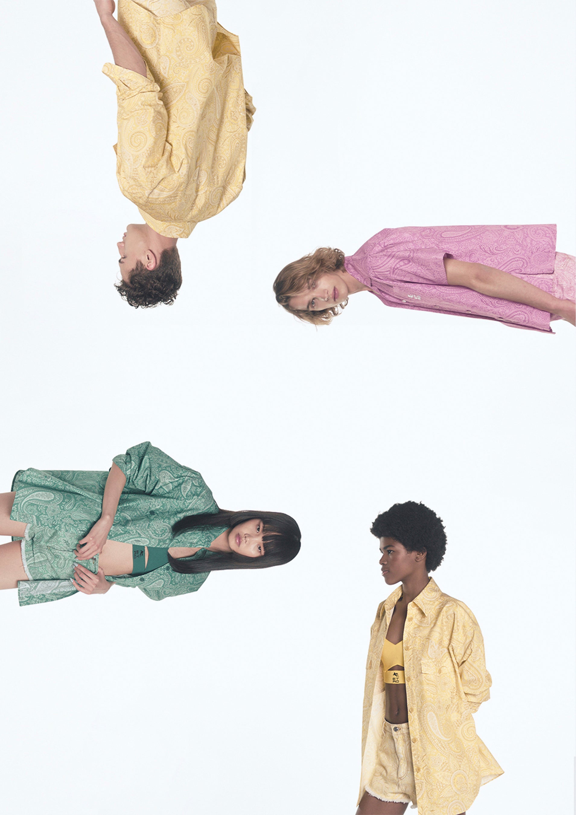 リキッドペイズリーは、キャンディピンク、エメラルドグリーン、サンフラワーイエローのフレッシュで喜びに満ちた明るいカラーパレットにより、ブランドを象徴するアイコニックコード、ペイズリーをコンテンポラリーに表現した、エトロのオープンかつインクルーシブなビジョンを伝えるジェンダーフルイドのコレクションです。