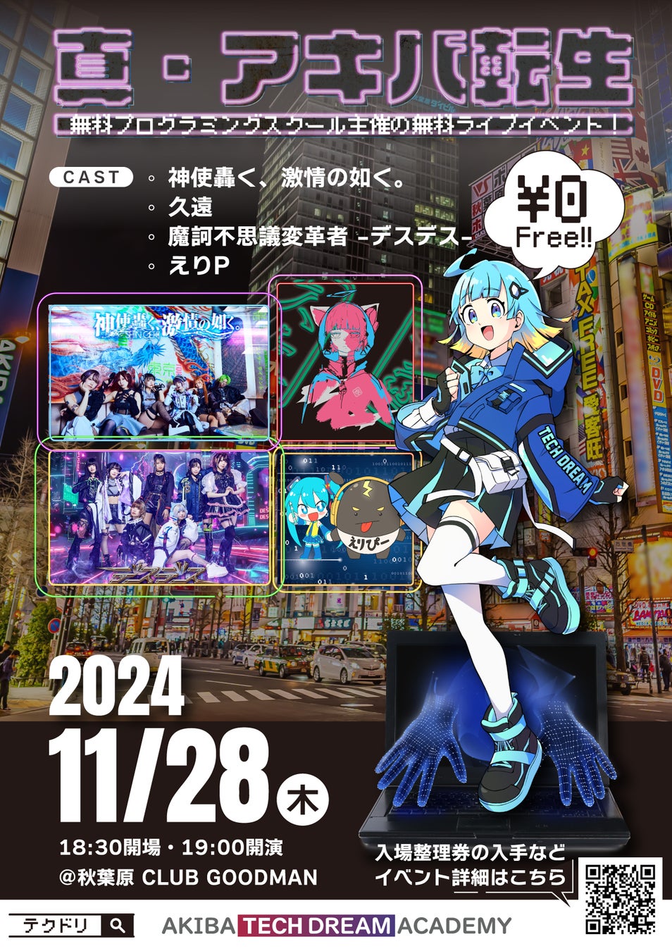 秋葉原に本校を置く無料プログラミングスクール「アキバ・テックドリーム・アカデミー」(テクドリ)は、2024年11月28日(木)に秋葉原にて、豪華なアイドルやバンドによる無料ライブイベントを開催します。