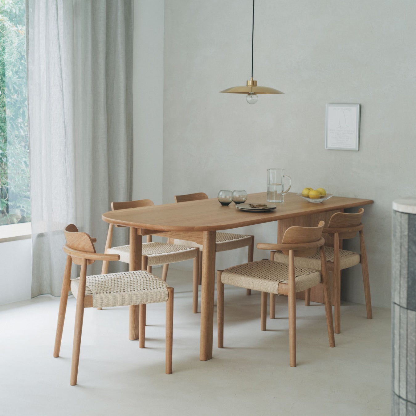 ダイニングテーブルは2種類の天板形状、3種類の天板サイズ、2種類の脚部からお好みの組み合わせをお選びいただけます。天板には、厚さ27mmの手馴染みの良い木質感を感じられるオーク無垢集成材を使用。チェアはアームをダイニングテーブルの天板に掛けられるので、浮かせると毎日のお掃除も快適に。ロボット掃除機もスムーズに通ります。