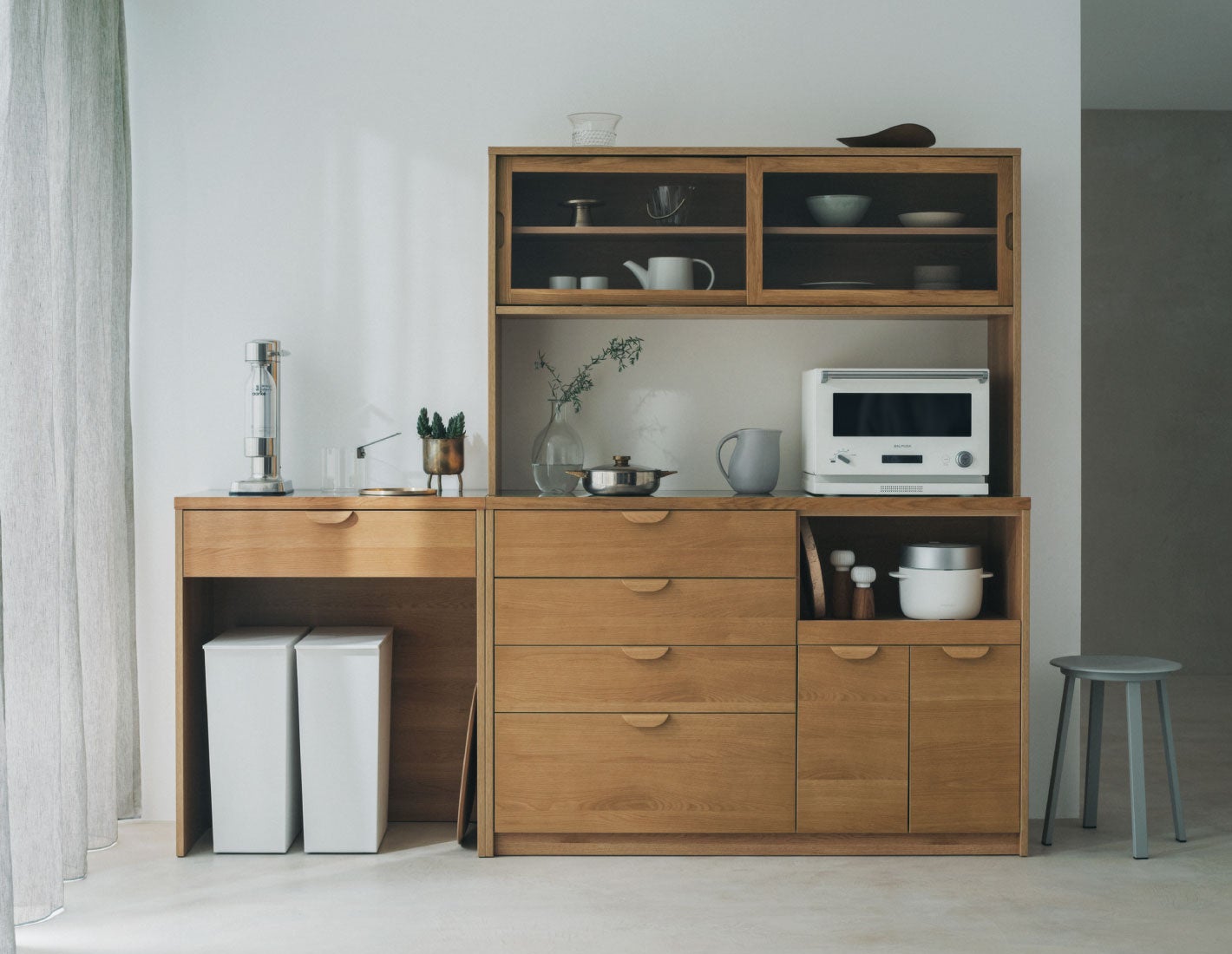 上台のガラス引き戸は、お気に入りのテーブルウェアなどを見せる収納をお楽しみいただけます。下台は炊飯器を収納するスライド棚を高めにすることで、日々の作業をより快適に。カトラリーや小皿などをしまいやすい、4段の引き出しを備えた収納力の高さも魅力です。最下段は奥に入った物まで取り出しやすいよう、フルスライドレールを取り入れました。