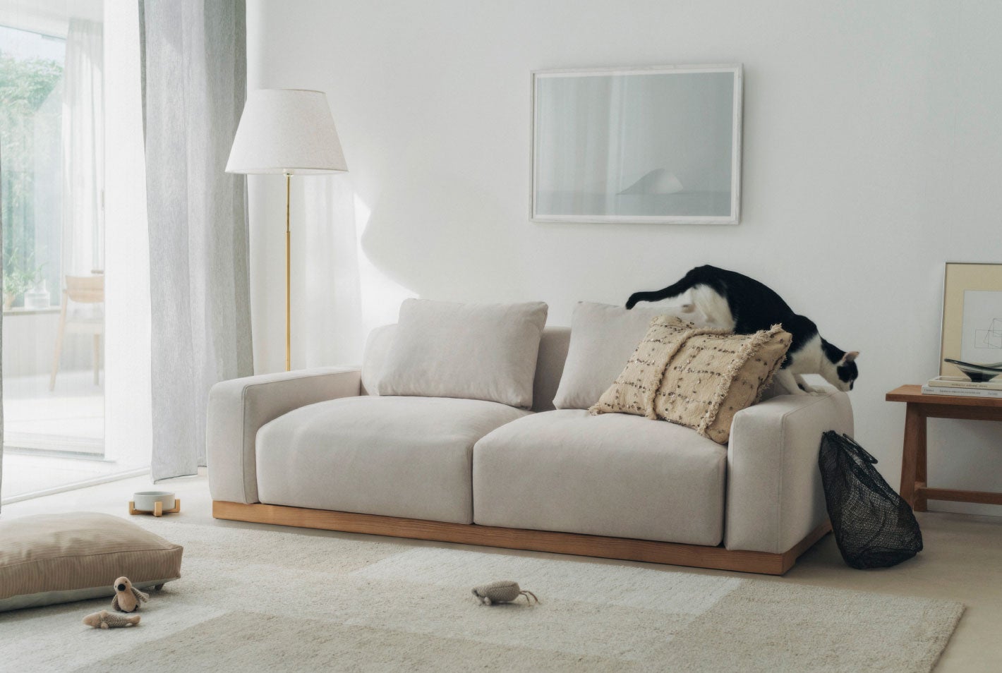 やわらかいフォルムに、コンテンポラリーな雰囲気をプラスしたソファ。シートの高さを370mmに設定した、ロータイプです。引っかきに強く、汚れを落としやすいイージークリーン加工付きの生地で、ペットや小さなお子さまとの暮らしにも寄り添います。座り心地は、やわらかめ、硬めの2種類を用意。ベースの木部は定番色のナチュラルのほか、6色のオーダーカラーからお選びいただけます。23色ご用意しているファブリックのカラーも含めて、自分だけのカスタマイズを楽しむことができるソファです。