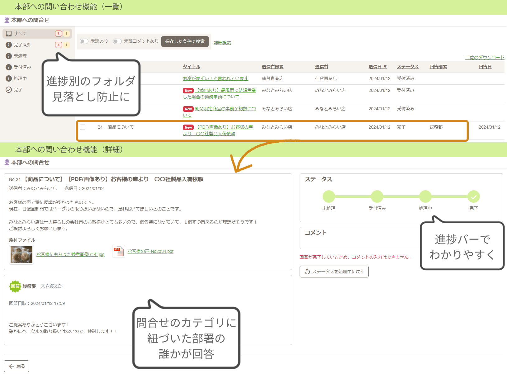 本機能により問い合わせ回答完了までにかかる時間や工数の削減、問い合わせ対応の属人化を解消します。