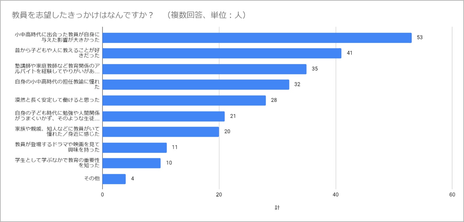 もともと教員を志望したきっかけも聞いたところ、「小中高時代に出会った教員の影響」(53人)や「昔から子どもや人に教えることが好きだった」(41人)「教育関係のアルバイトでやりがいを感じた」(35人)といった回答が上位でした。
