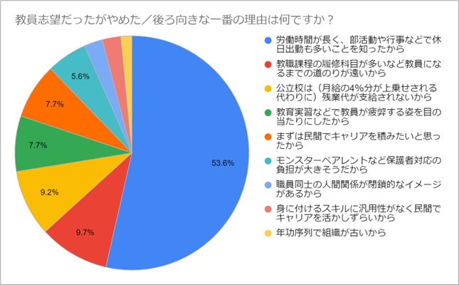 教員志望だったがやめた、もしくは後ろ向きと答えた学生にその一番の理由を聞いたところ「労働時間が長く、部活動や行事などで休日出勤も多いことを知ったから」が最も多く53.6%でした。次いで「教職課程の履修科目が多いなど教員になるまでの道のりが遠いから」が9.7%で、「公立校は残業代が支給されないから」と回答した学生は9.2%でした。