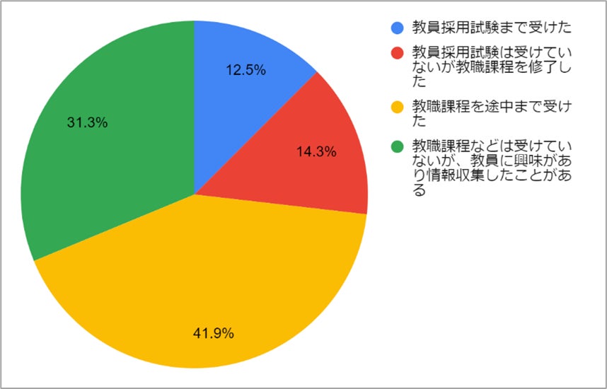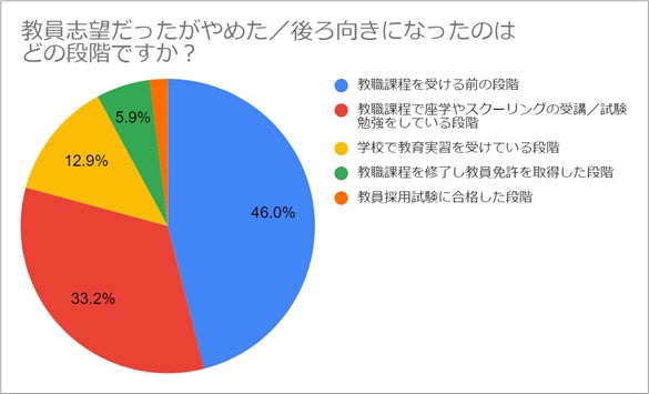 調査結果②の回答者に、教員志望だったがやめた、もしくは後ろ向きになったのはどの段階か質問したところ、「教職課程を受ける前の段階」が5割弱(46%)、「教職課程で座学やスクリーニングの受講/試験勉強をしている段階」が33.2%で、学校で教育実習を受ける前に8割の学生が労働環境などの情報を収集して後ろ向きになったことがわかりました。