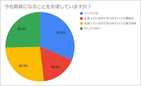 教員を志望したことがある学生に「今も教員になることを志望していますか?」と聞いたところ、「していない」が25.4%、「迷っているがどちらかというと後ろ向き」が26.5%で計51.9%が教員になることを諦めたり志望度が下がったりしていることがわかりました。