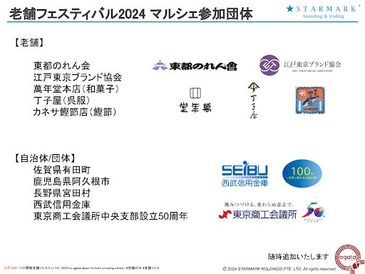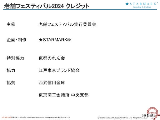 日本全国の老舗の逸品を扱うECサイト「老舗通販.net」を運営するスターマーク株式会社(老舗フェスティバル実行委員会)は、10月20日の「老舗の日」にちなんで、日本が世界に誇るべき老舗の伝統技術や文化に触れて頂くイベント「老舗フェスティバル2024 by agataJapan」を開催いたします。
