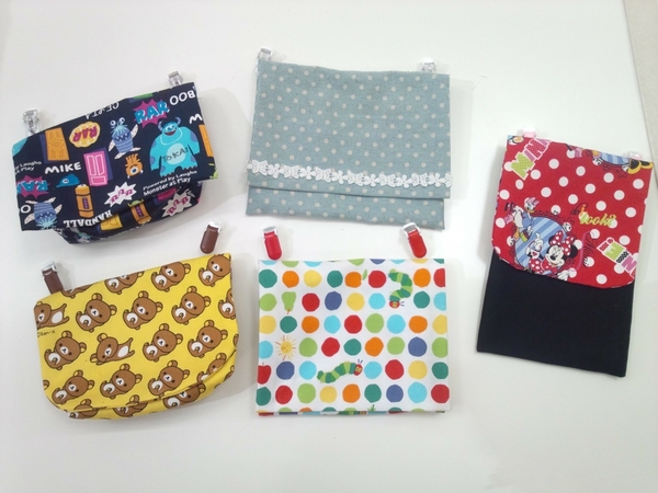 昨今の子供服は、ポケットがなかったり小さかったりして物を入れられるところが付いていないデザインのものが多くなっています。しかし、幼稚園・保育園や小学校ではハンカチ・ティッシュの携帯は必須。そのために携帯品が持ち歩けるポケットバッグが必要になります。ポケットバッグは市販されていないため手作りすることが多く、手作りアイテムが多いバザーの商品としても数多く出品され、「たたんで返して」シリーズは、小さなお子様を持つお母様たちに大人気なのです。