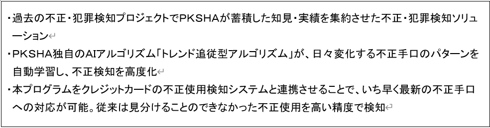 今回のシステムは、PKSHA独自のAIアルゴリズムを運用・サポートするSCSK株式会社(本社:東京都江東区、代表取締役 執行役員 社長 最高執行責任者:當麻隆昭)が三菱UFJニコスの不正使用検知システム向けにカスタマイズしたものです。AIを活用し、日々変化する不正使用の手法を自動で学習し続けることで、最新の手口にも柔軟・スピーディに対応し、不正検知の精度を一層向上させるものです。