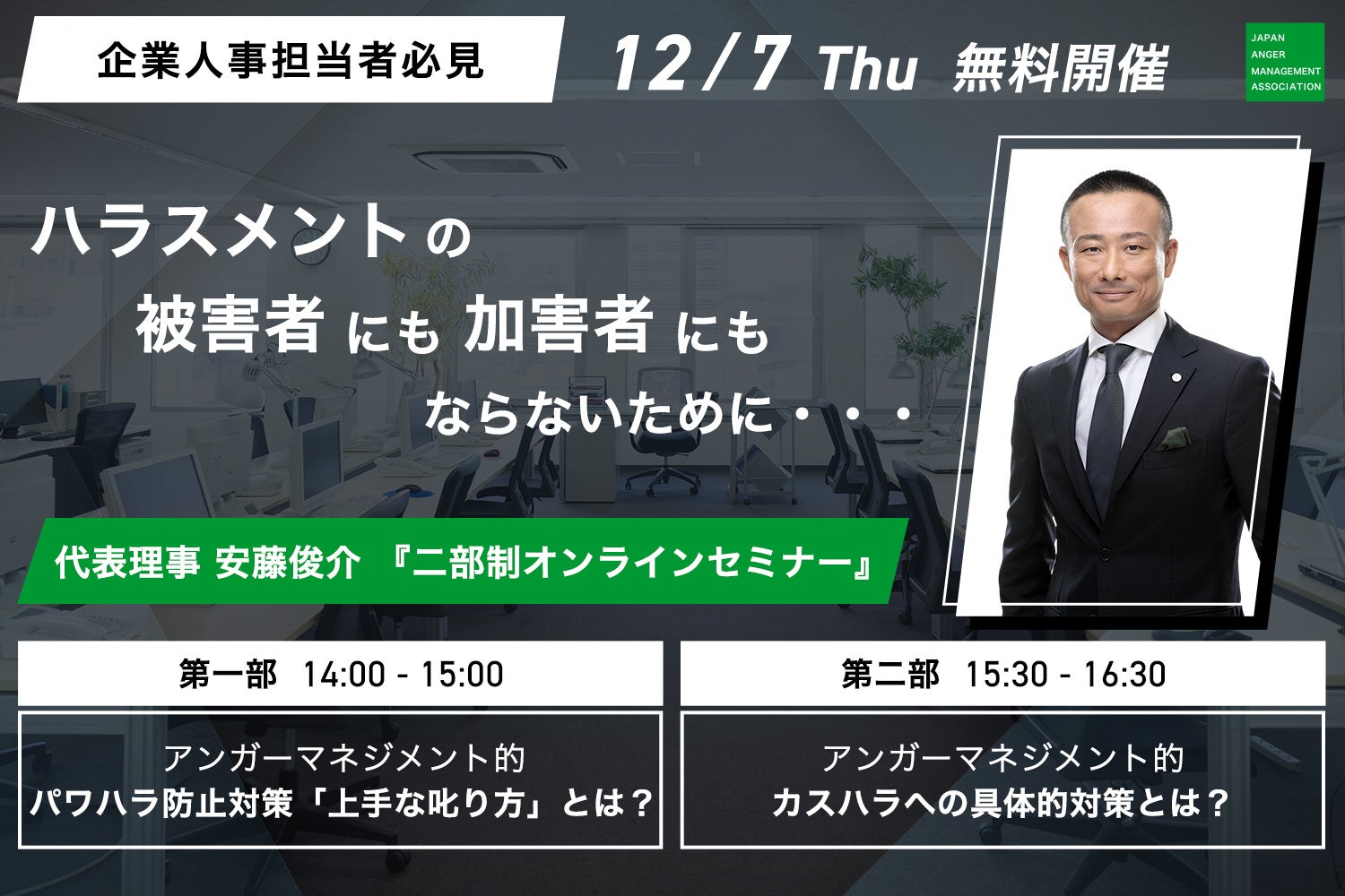そこで今回は、お互いの人権を尊重しハラスメントのない職場を目指す企業が世の中に溢れることを目指し、表彰制度「アンガーマネジメント経営賞」を創設した日本アンガーマネジメント協会代表理事 安藤俊介が、パワハラ・カスハラをテーマとした二部制オンラインセミナーに登壇します。